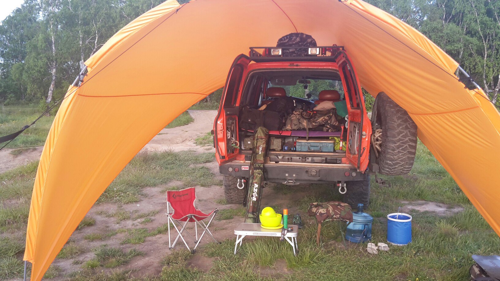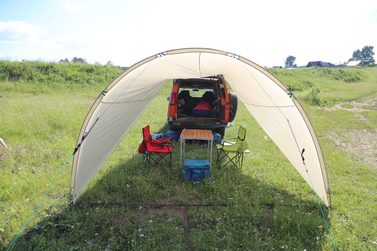 - Первый вариант установки: Палатка-тент имеет одну дугу, которая крепится оттяжками к земле. Противоположный край тента крепится к багажнику автомобиля. Под навесом можно расставить кемпинговую мебель