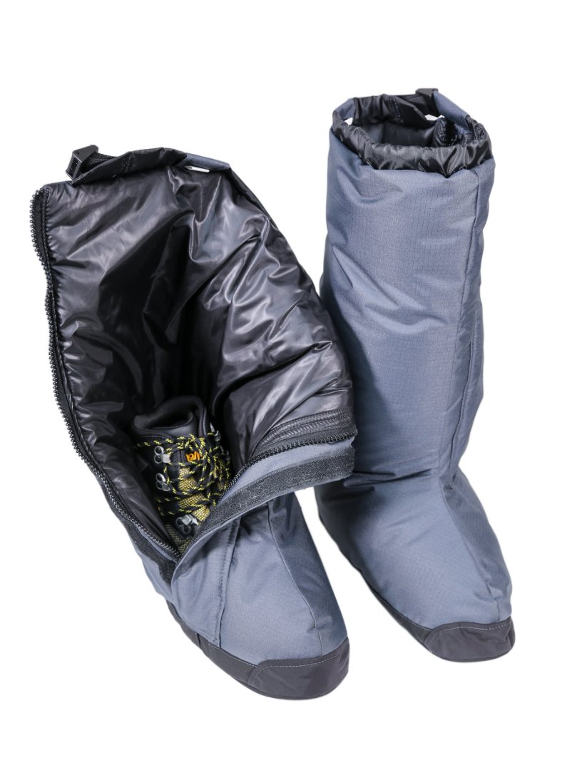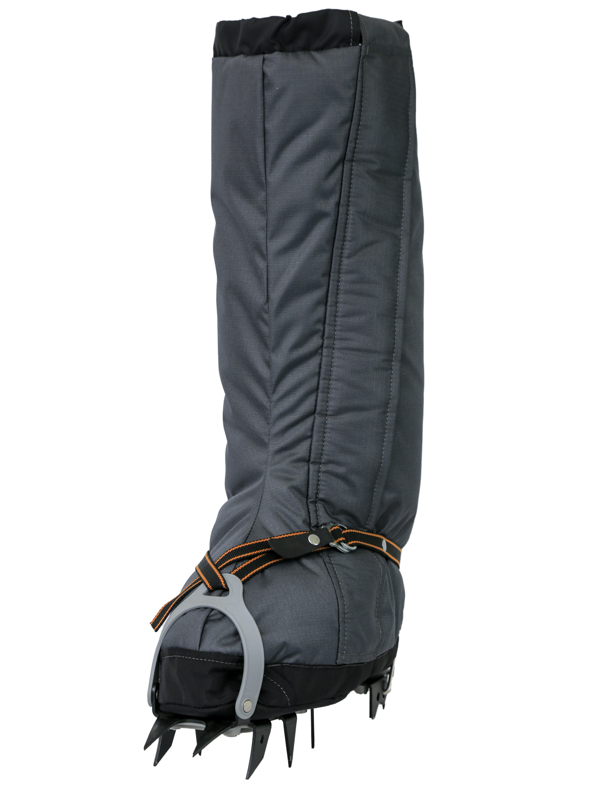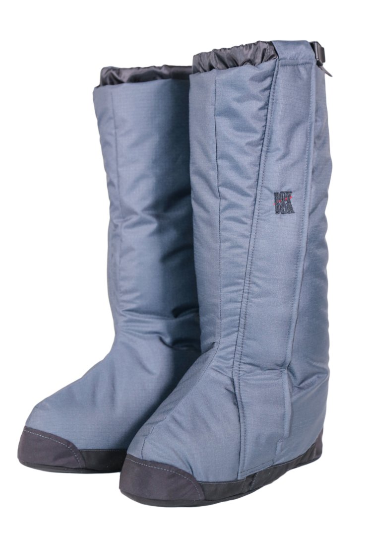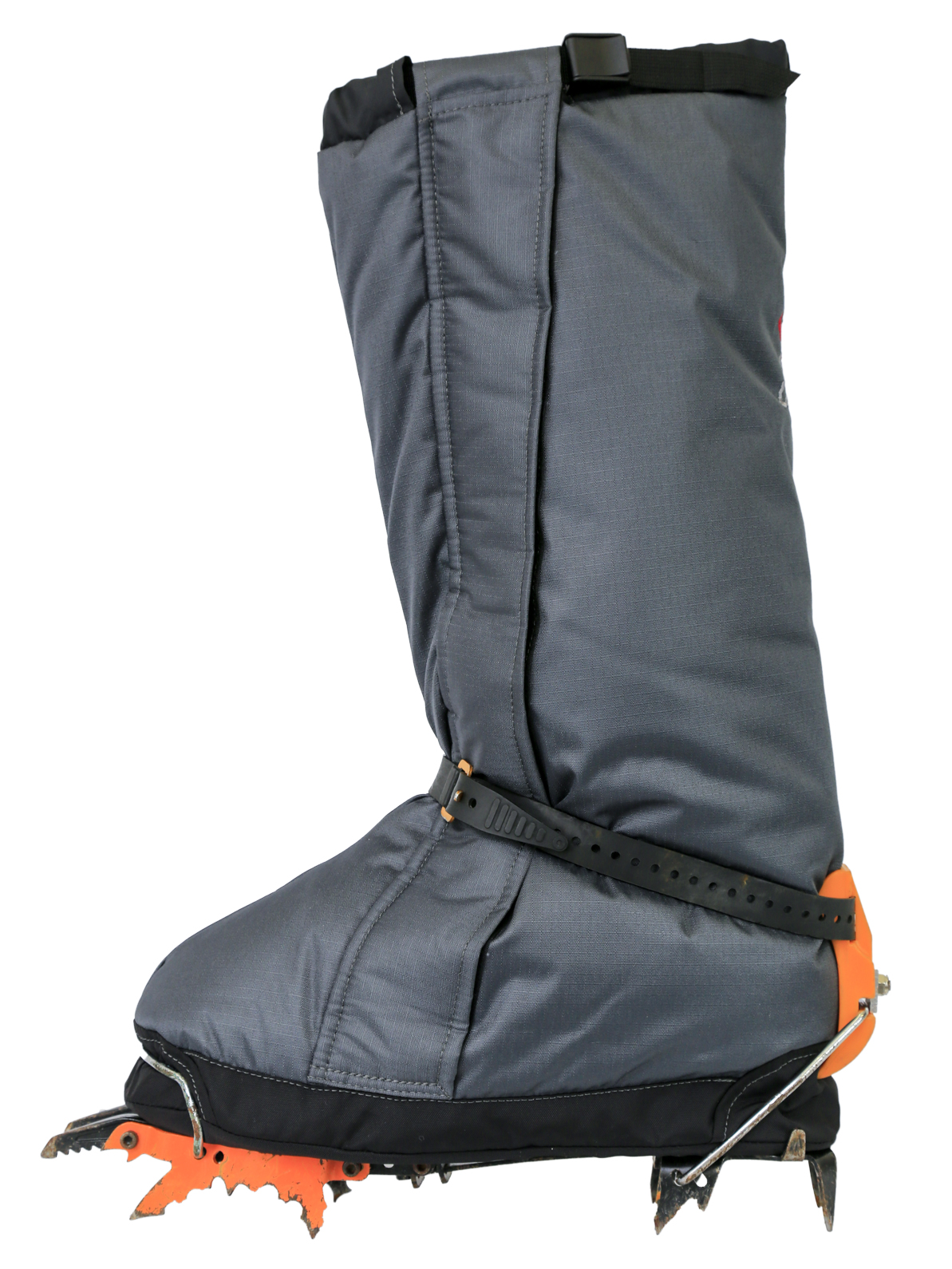 - На носке и пятке вставки из прочной ткани Авизент без утеплителя, что позволяет использовать бахилы с любыми типами альпинистских кошек. Отсутствие утеплителя на носке и пятке это вынужденная мера, которая не влияет на утепление ботинка