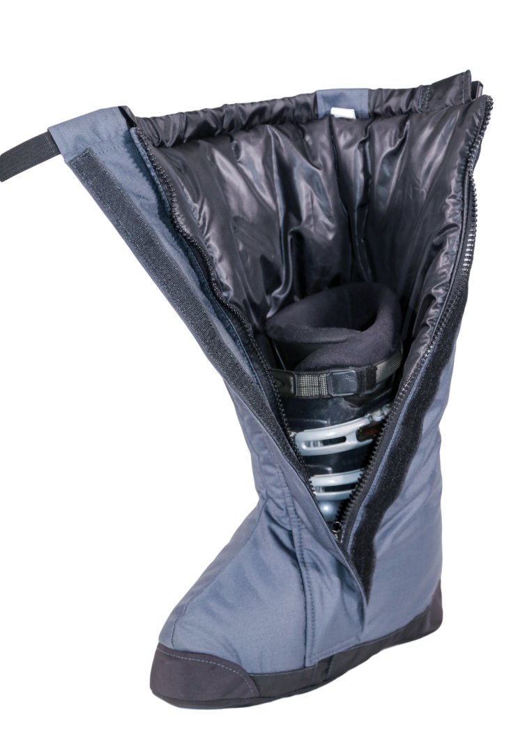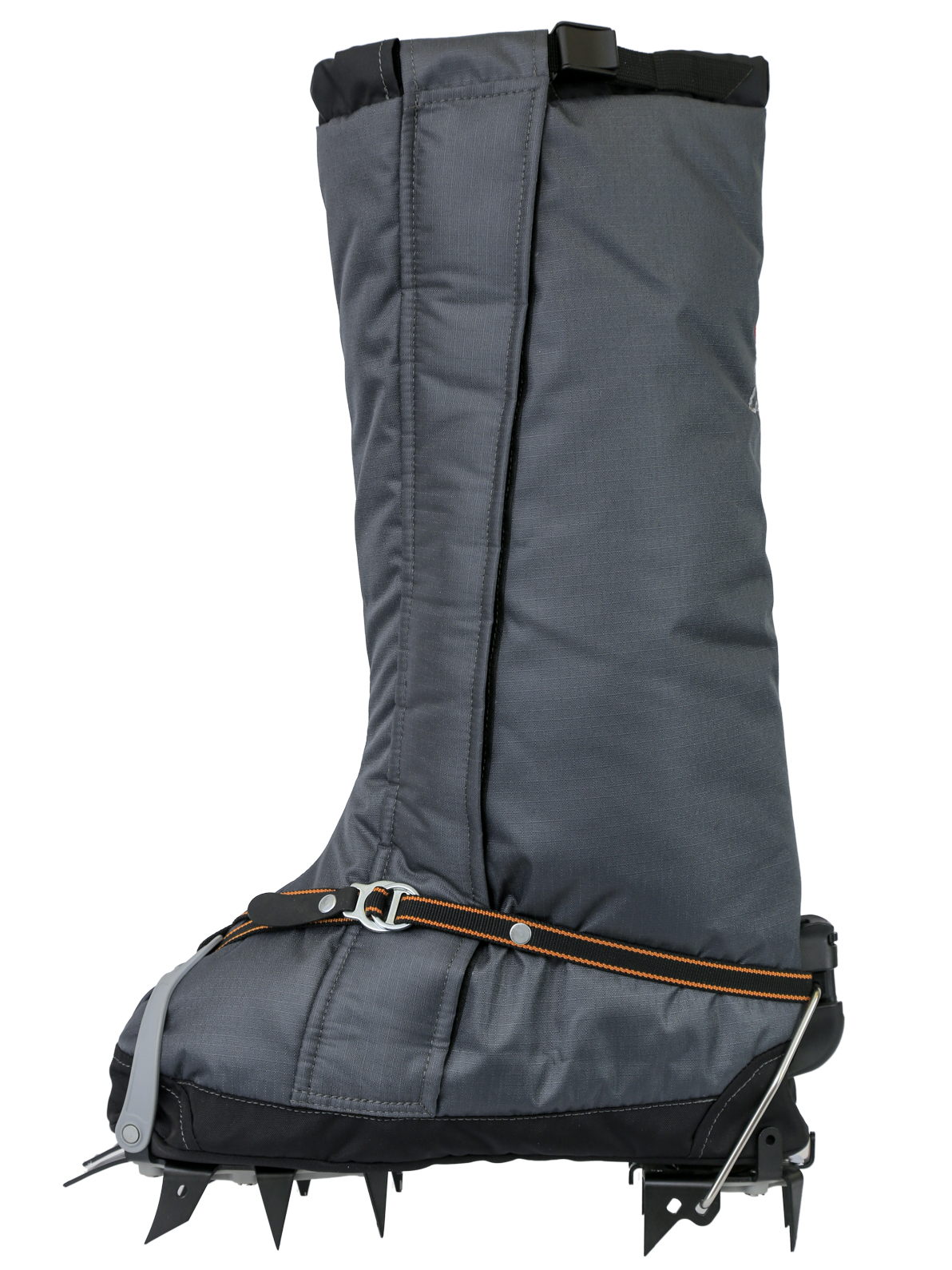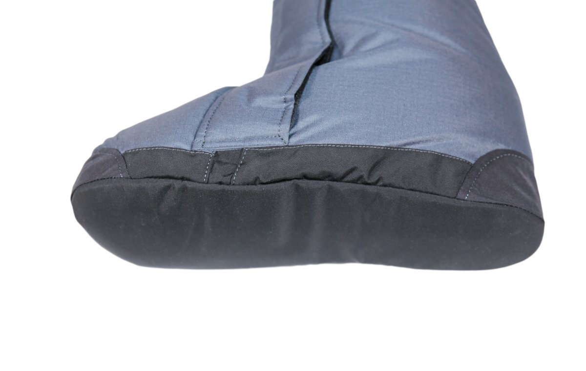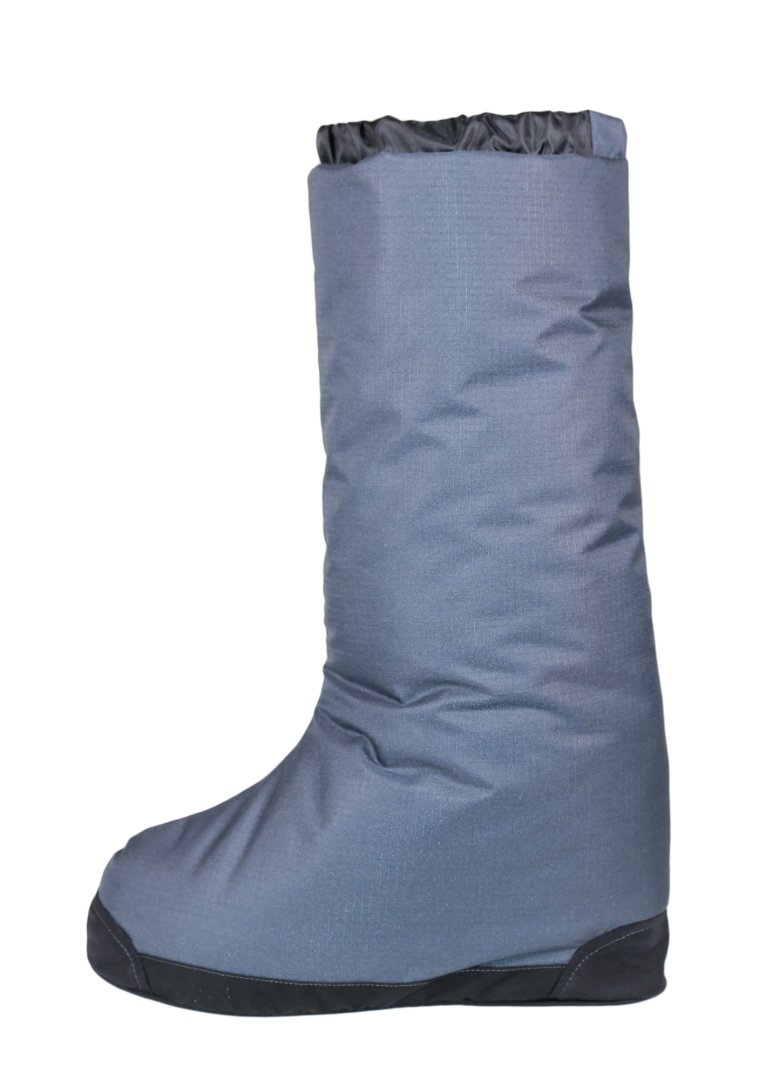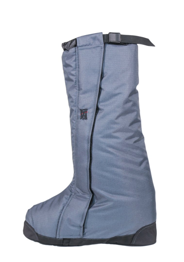 - На носке и пятке вставки из прочной ткани Авизент без утеплителя, что позволяет использовать бахилы с любыми типами альпинистских кошек. Отсутствие утеплителя на носке и пятке это вынужденная мера, которая не влияет на утепление ботинка