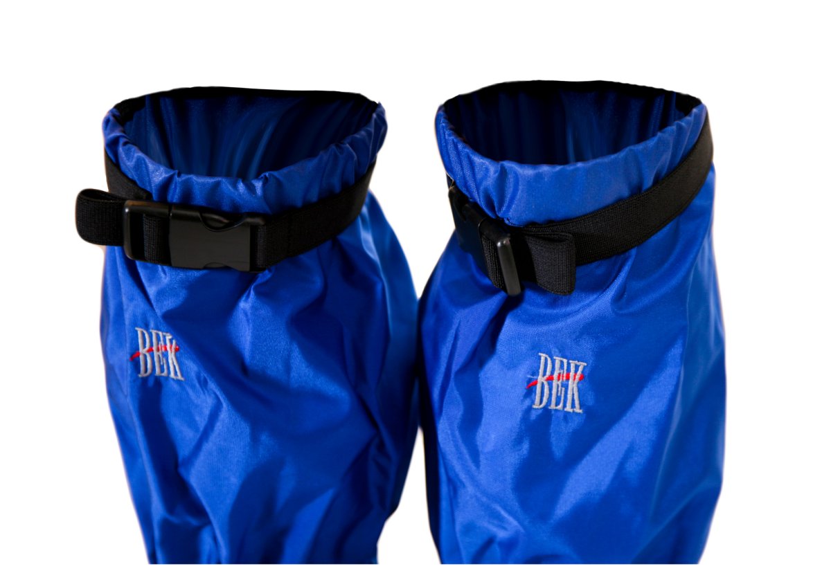 - Верхний край бахил фиксируется под коленом и регулируется по объему резинкой с застежкой фастекс