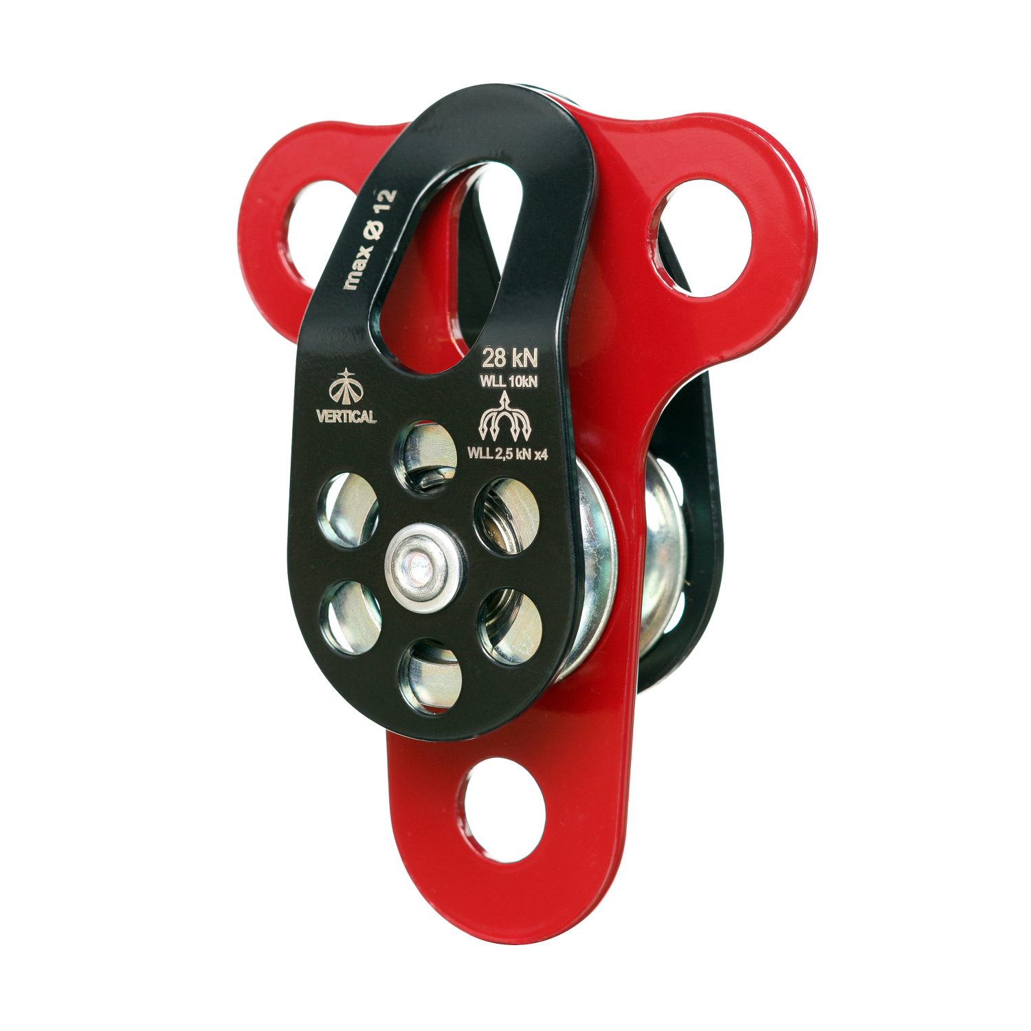 Блок-ролик двойной стальной с подшипником - предназначен для использования в полиспастных системах. Допускает использование как одинарной, так и двойной веревки. Выпускается с подшипником. Имеет третью разделительную щеку с нижним отверстием под карабин, и тремя верхними отверстиями. Дополнительные отверстия позволяют присоединить еще одни или два ролика, зажим в качестве блокиратора обратного хода или закрепить конец веревки, участвующей в полиспастной системе. Также можно объединять ролики для передвижения грузов по двойным горизонтальным перилам.