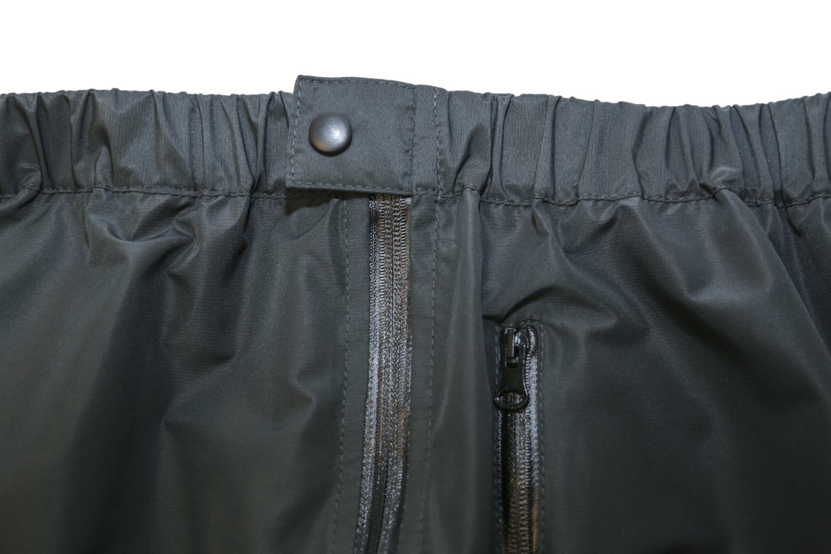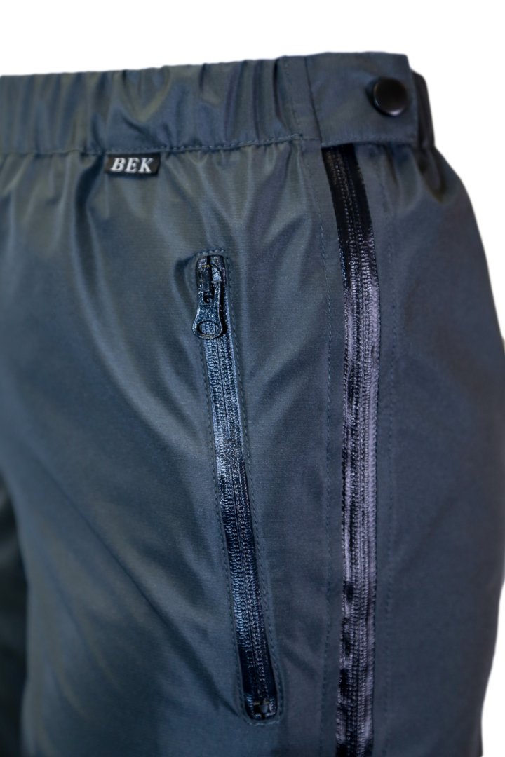 - На брюках по бокам две влагозащитные молнии, они позволяют одевать и снимать брюки не снимая обувь, что очень удобно при резком изменении погоды в походных условиях