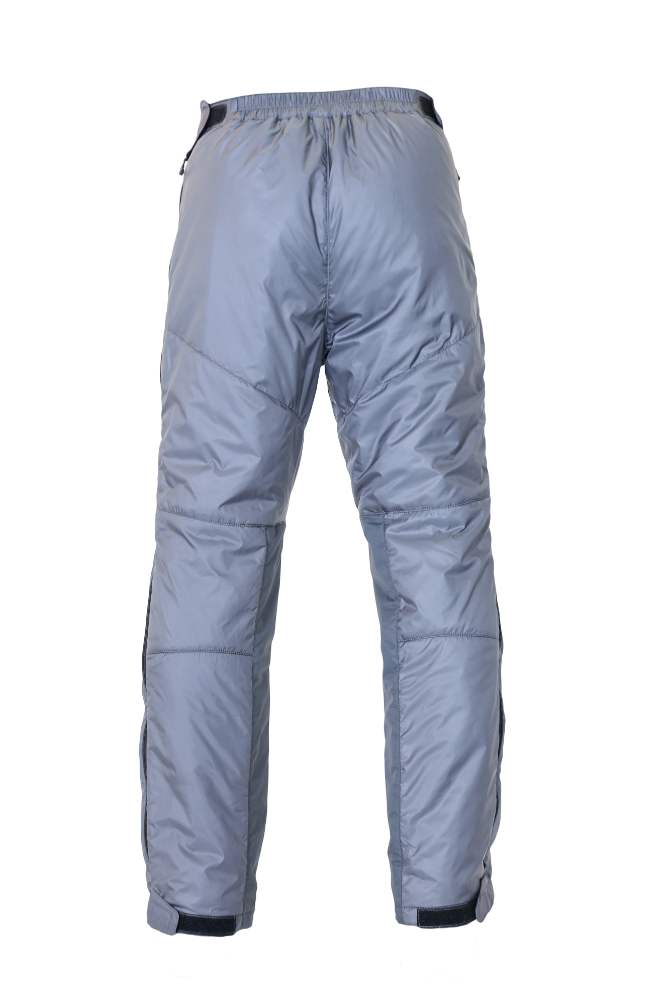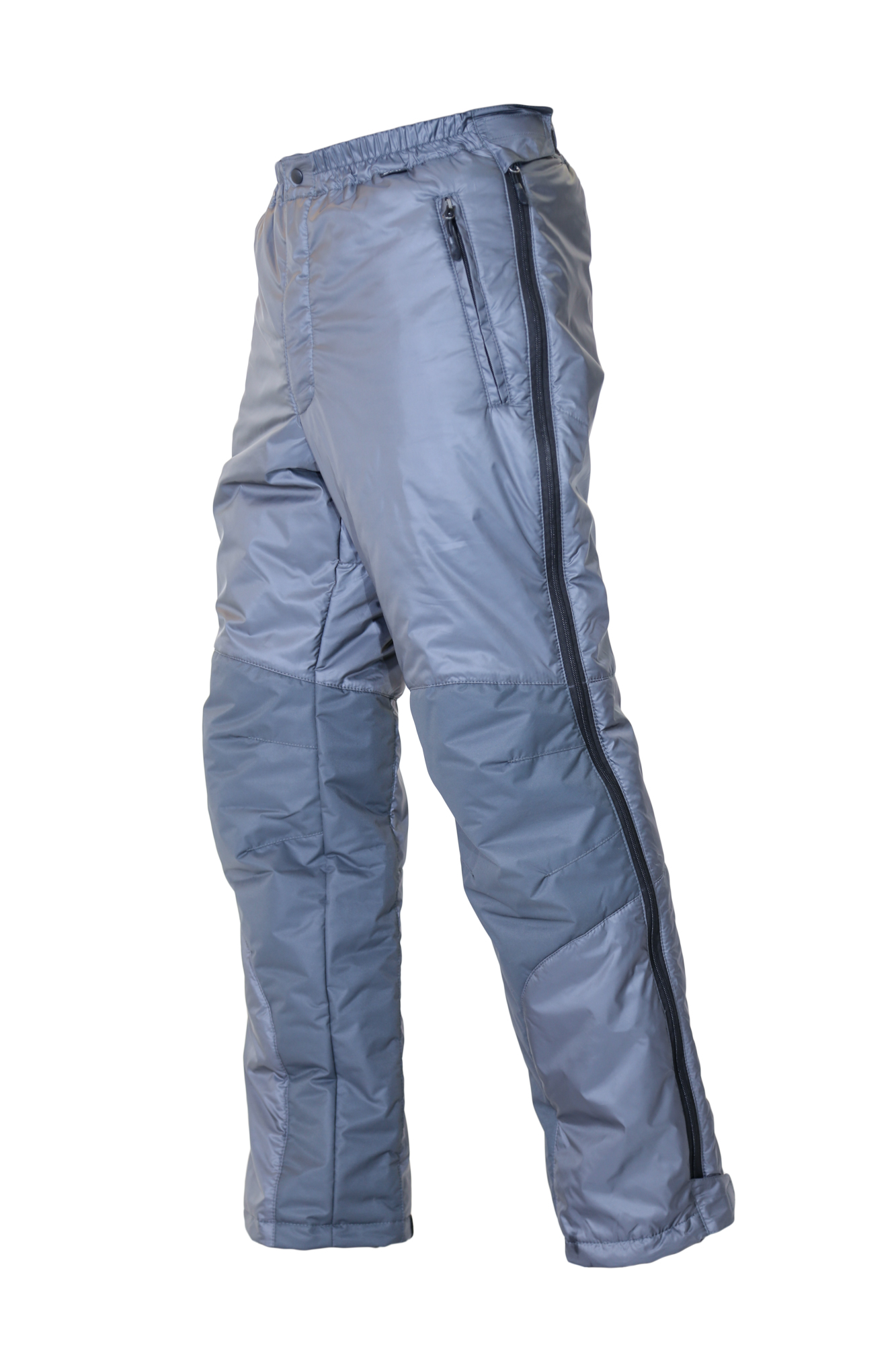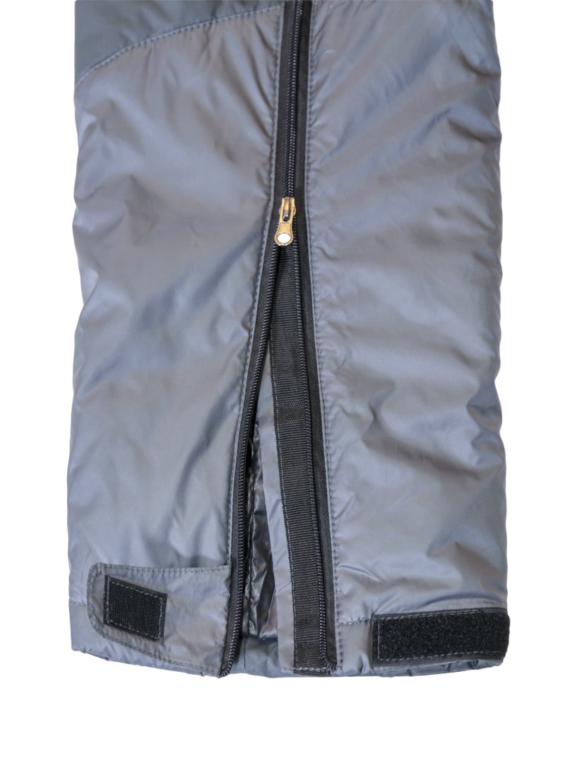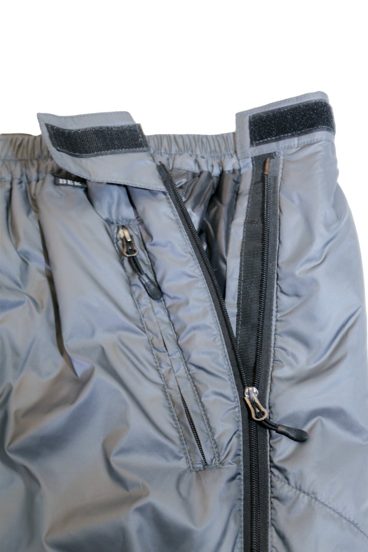 - На брюках две разъемные молнии по бока. Для одевания и снимания брюк не нужно снимать обувь, это удобно если необходимо утеплиться при резком изменении погоды в походных условиях, при занятии спортом, в альпинизме.