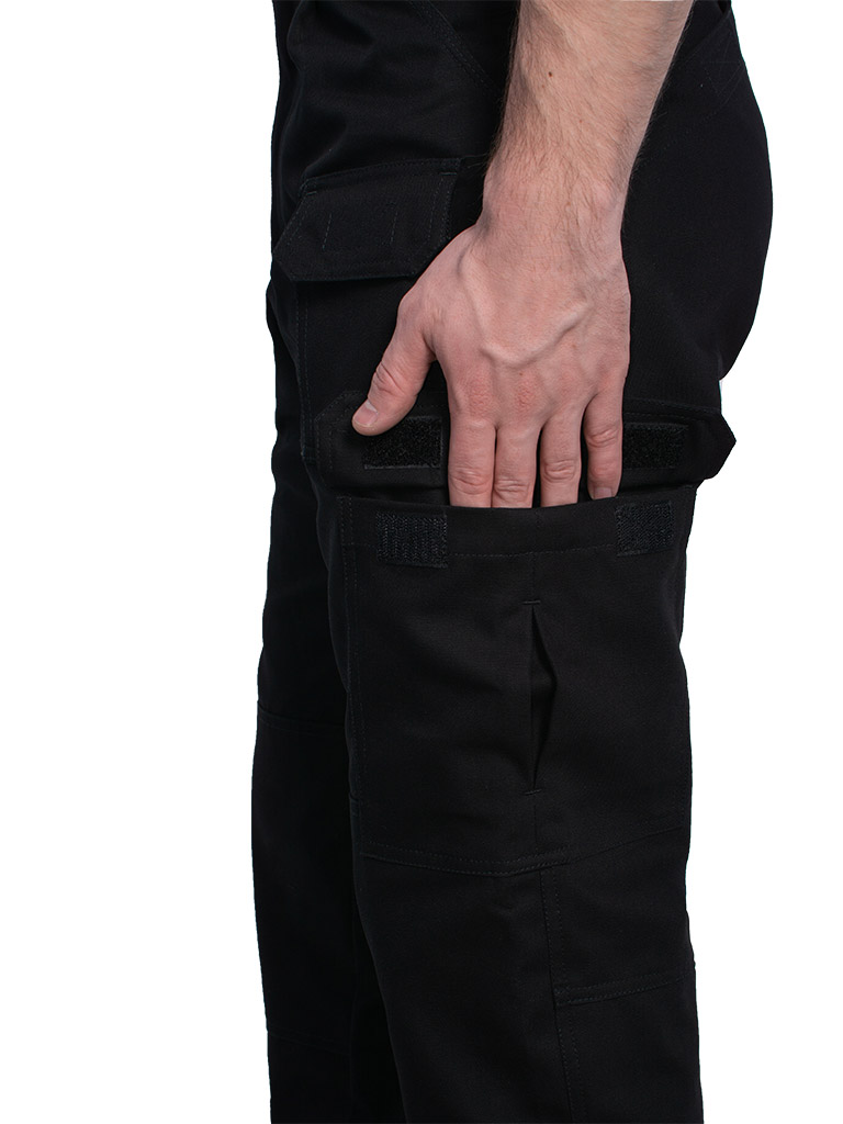 Над уровнем колена, по боковым швам изделия, накладные объемные боковые карманы с клапаном на "велкро".
