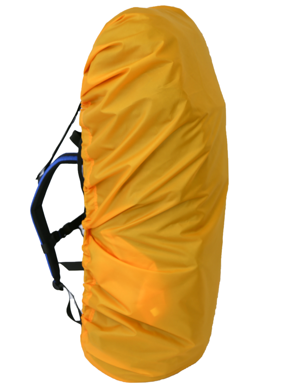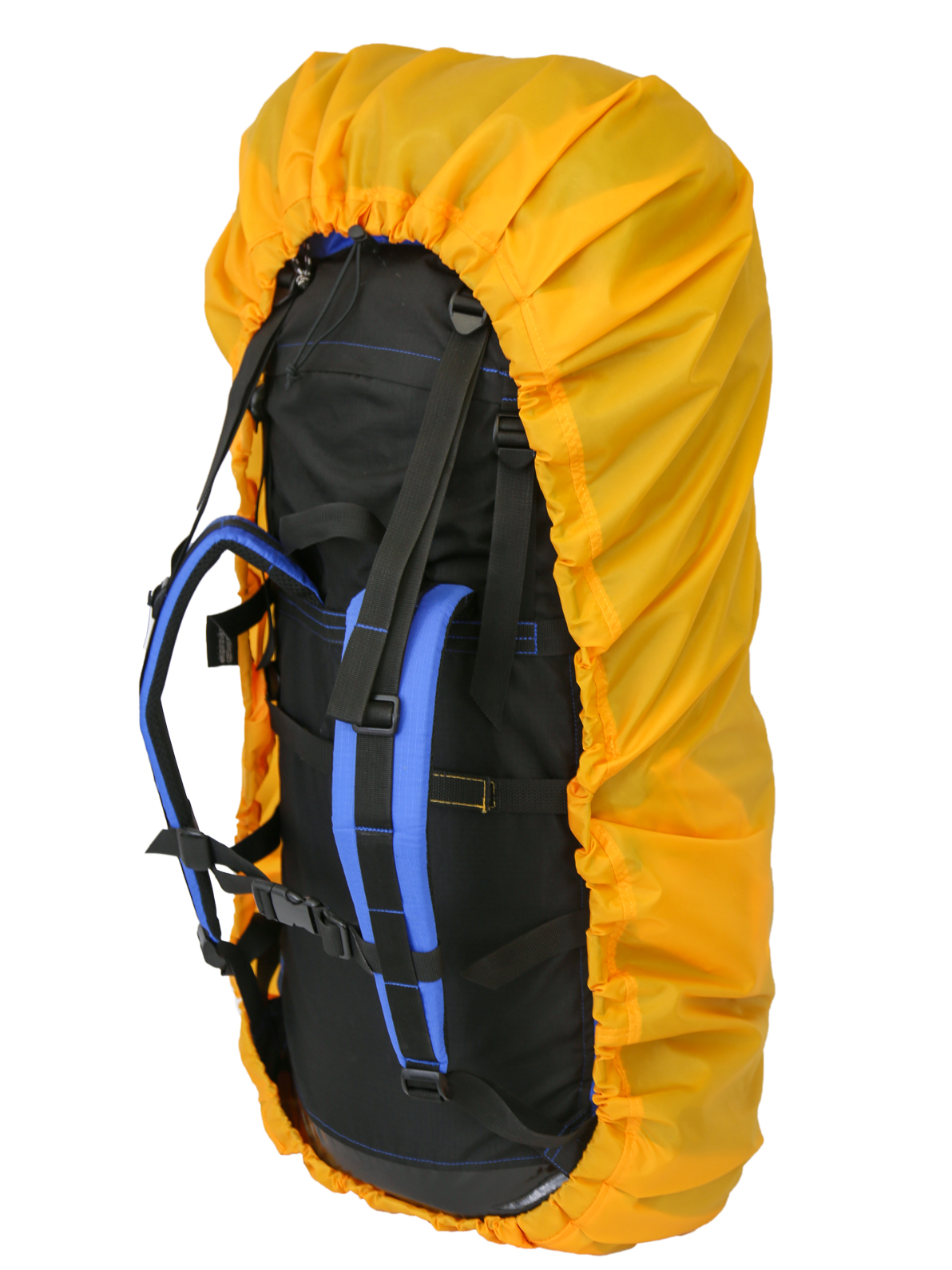 - Закрепляется на рюкзаке 60-90л при помощи эластичного шнура, пропущенного по контуру гермочехла и стропами по центру спины рюкзака скрепляющимися лентой Velcro
