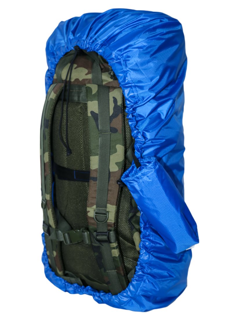 - Закрепляется на рюкзаке 90-120л при помощи эластичного шнура с фиксатором, пропущенного по краю чехла и стропы с застежкой Velcro