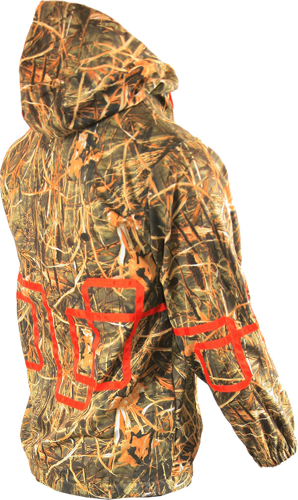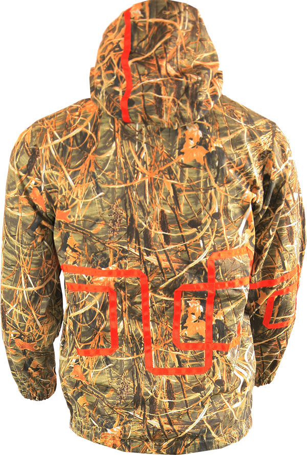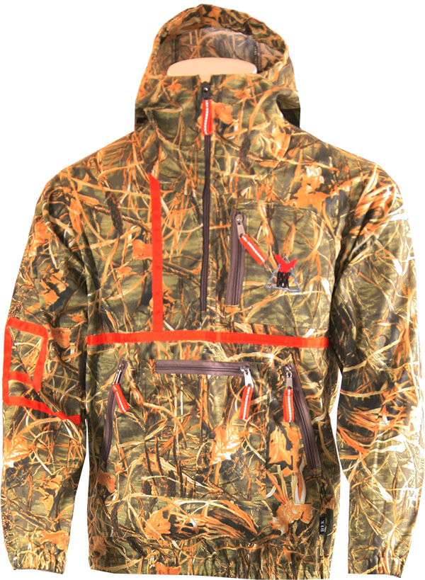 Анорак Век Следопыт-К - летний анорак маленьких размеров для любителей активного отдыха на природе. Главная отличительная особенность анорака в том, что он надевается через голову и не имеет стандартной для курток застежки на молнию по центру. Оригинальный камышовый принт, ассиметричные нашивки на рукавах и спине контрастного цвета.