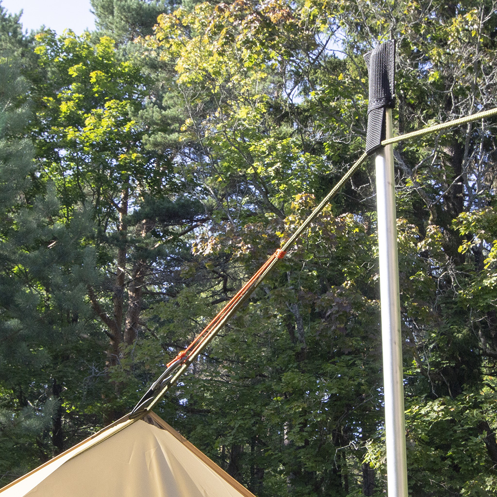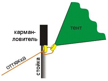 Для установки - прикрепить карман-ловитель к петле оттяжки тента. Вставить конец стойки в карман-ловитель. Установить оттяжку.