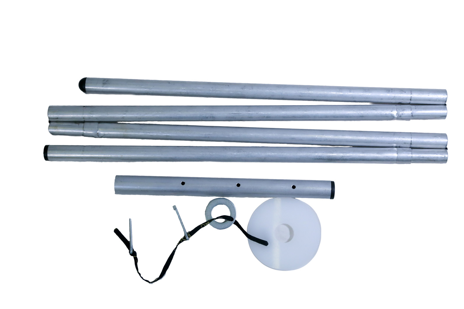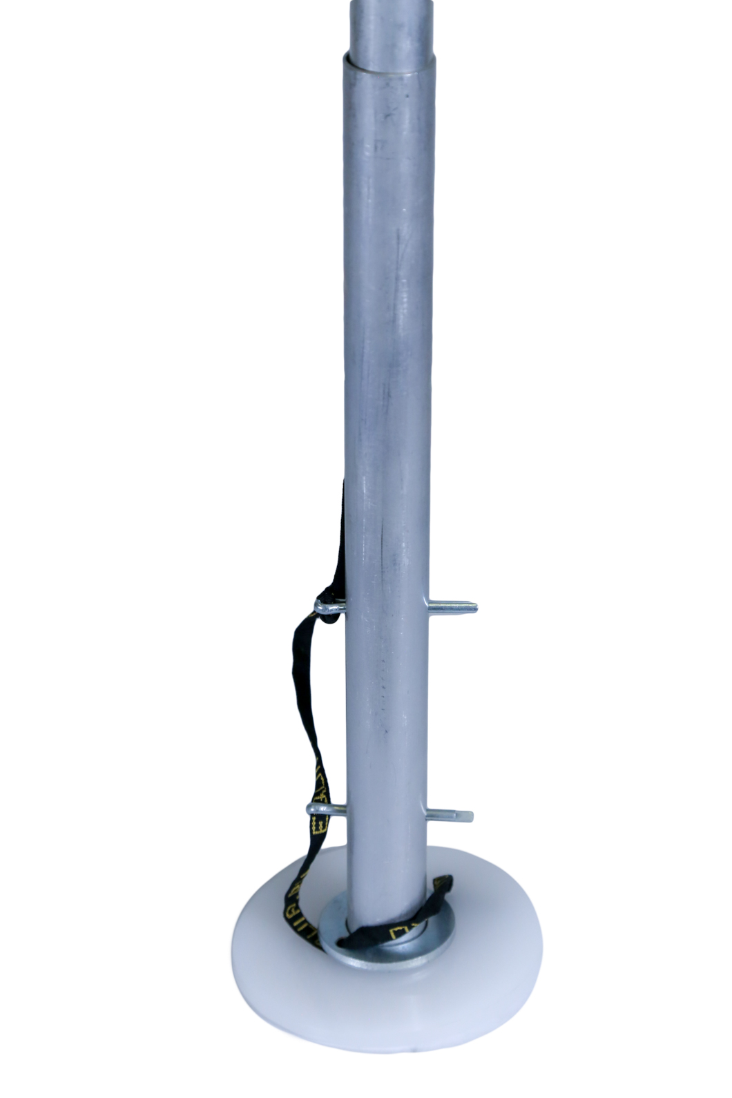 Центральная стойка устанавливается в металлический «стакан» с пластиковым кольцом, которое не дает стойке провалиться в снег. Стакан позволяет отрегулировать высоту стойки.При перестановке верхнего шплинта в более высокое отверстие происходит увеличение длины центральной стойки. Это необходимо сделать, если часть стойки провалилась в снег. Нижний шплинт необходим для опоры пластикового диска. При установке этого шплинта в более высокое отверстие увеличивается заглубление стакана в снег, что может быть полезно при сильном ветре. Диапазон регулировки высоты стойки 2,00 - 2,15м