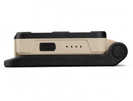 Аккумуляторная лампа оборудована несъёмным Li-polymer (литий-полимерным) аккумулятором ёмкостью 2600 мАч, который подзаряжается от стандартного порта USB, кабель для зарядки входит в комплект. Сбоку фонаря, рядом с портом зарядки, расположен 4-ступенчатый светодиодный индикатор уровня заряда, который, также, служит в качестве индикатора зарядки.