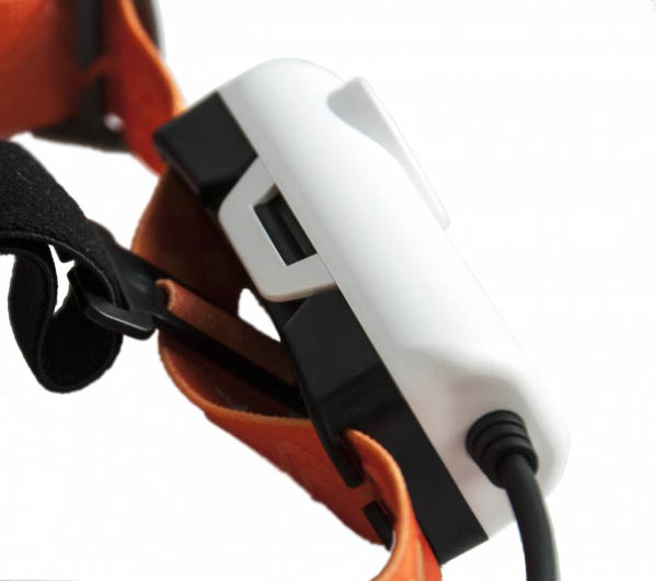 На креплении, также, размещён держатель провода, соединяющего "голову" фонаря и батарейный отсек, поэтому провод не болтается и не мешает при передвижении.