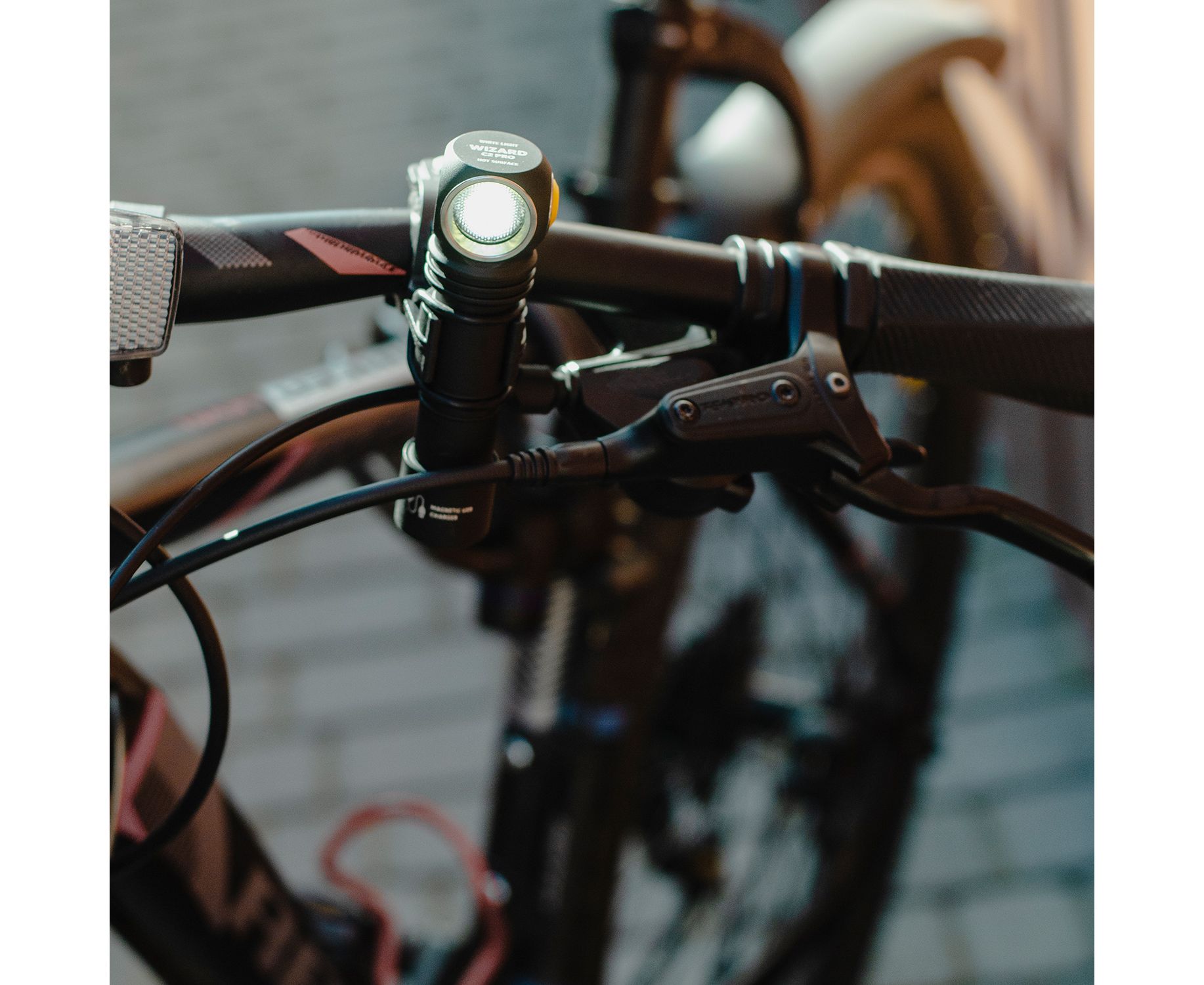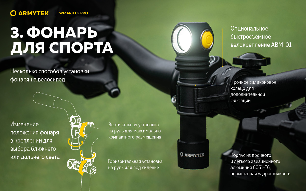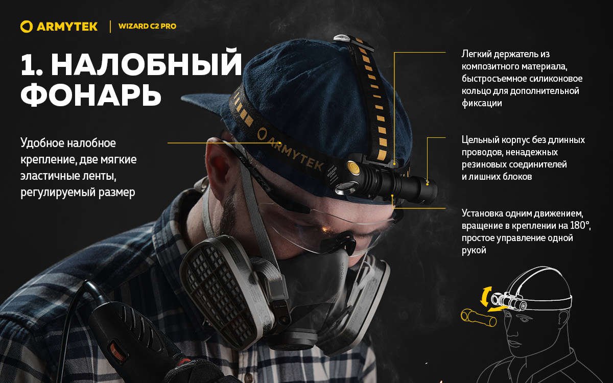 В комплект входит комфортное налобное крепление, клипса для фиксации на одежде или рюкзаке и велокрепление ABM-01. Wizard C2 Pro совместим с креплением на каску AHM-02 и подходит для строительных работ.
