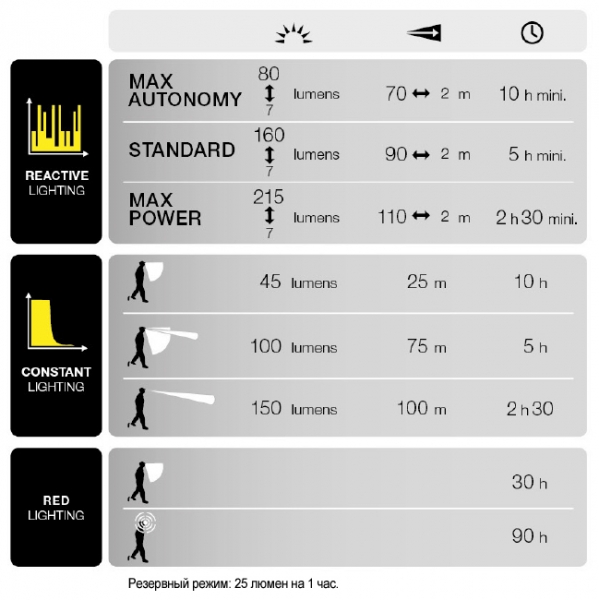 Технология REACTIVE LIGHTING определяет мощность фонаря в зависимости от освещения окружающей среды, благодаря специальному сенсору. Высокая мощность будет поддерживаться на всем протяжении использования фонаря. Система адаптивного освещения позволяет избавить руки от регулировок.