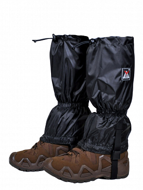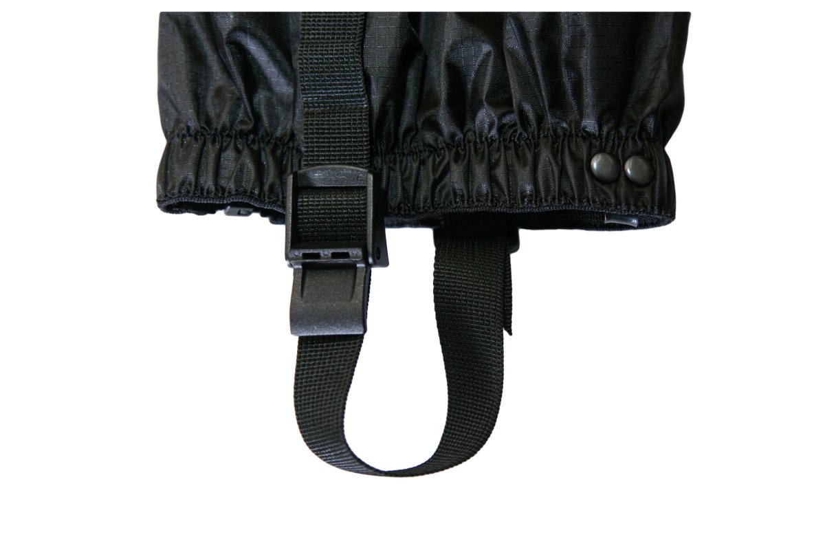 - Передний крючок гамаш крепится к шнуркам ботинка. Низ прочно удерживается регулировочным ремешком из стропы под каблук обуви