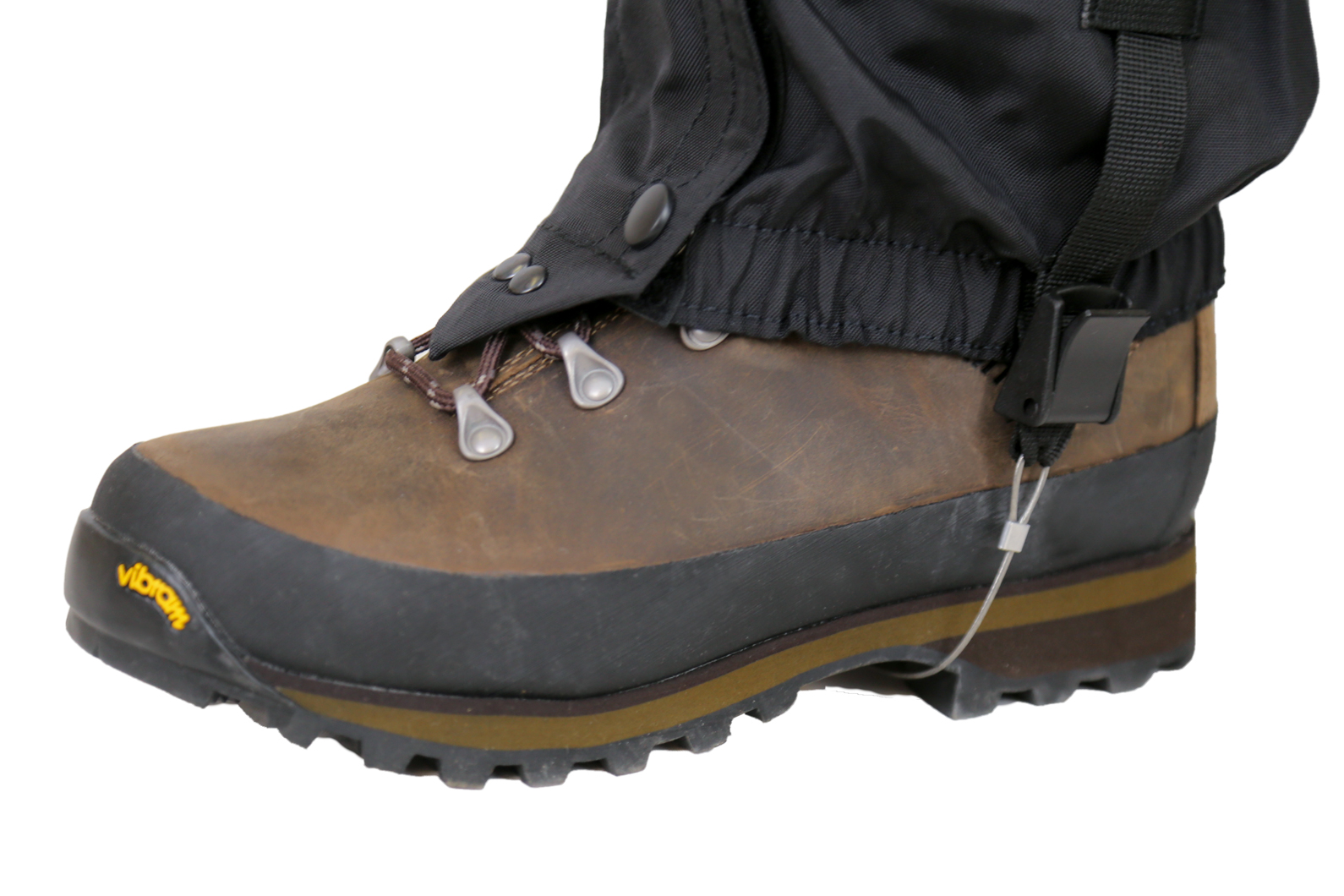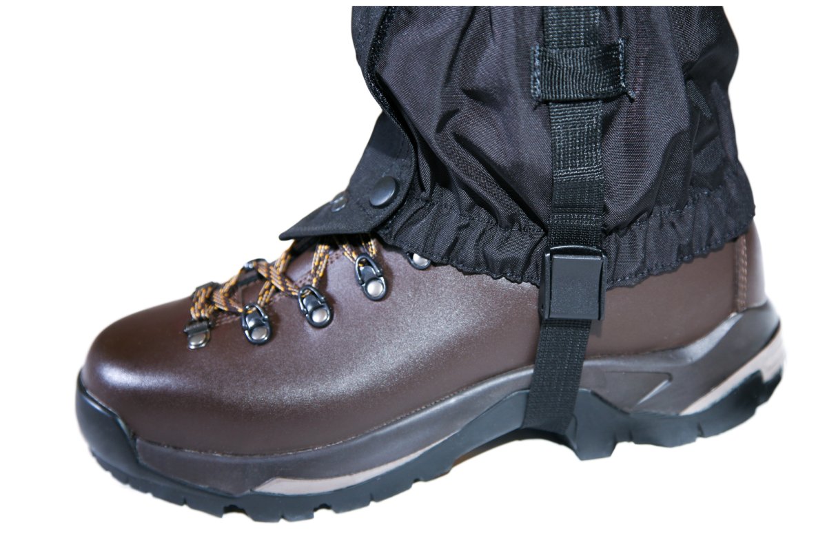 - Гамаши на обувь Век Эдельвейс крепятся к ботинку крючком и регулируемым ремешком из стропы под каблук.