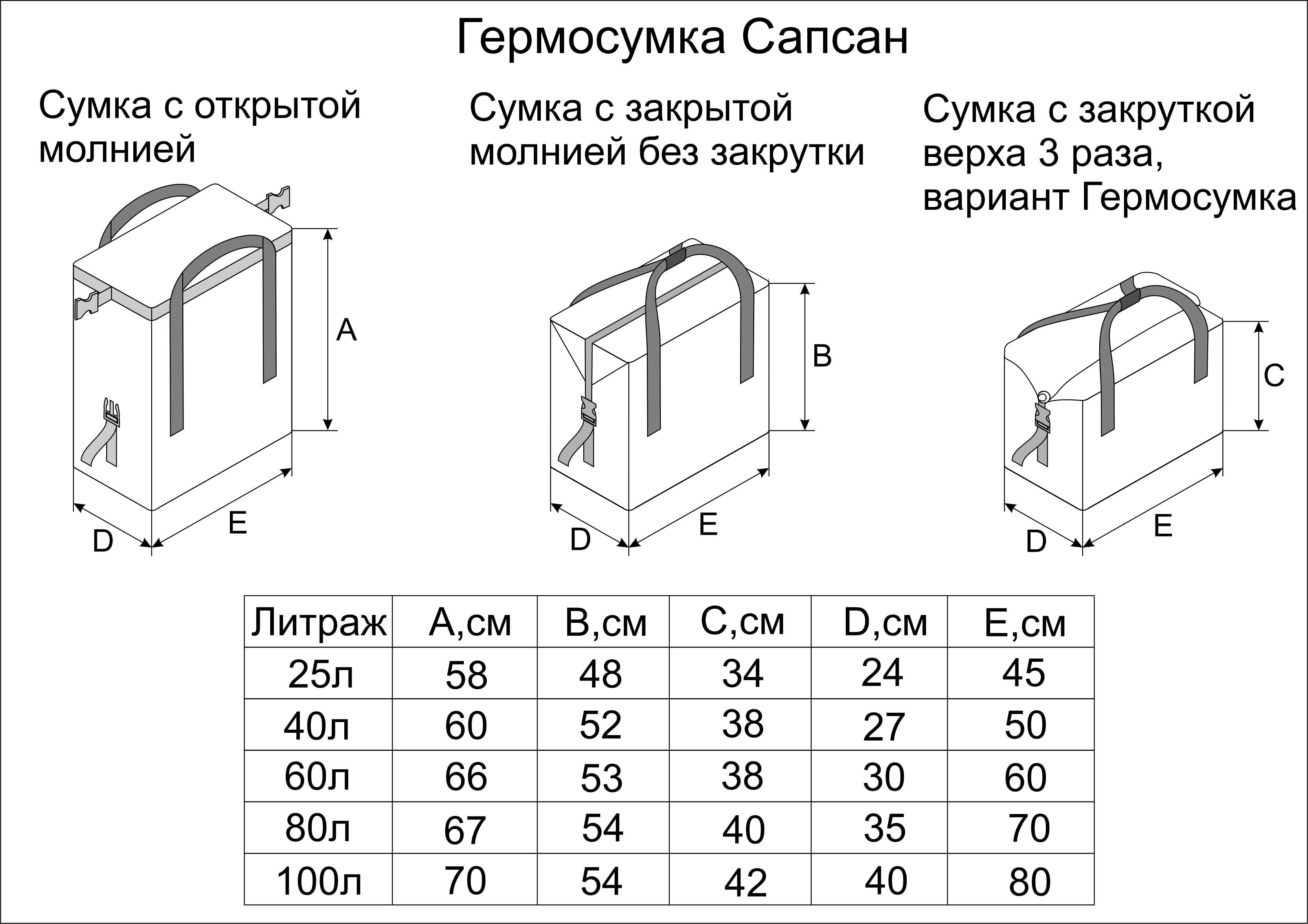 - Линейка гермосумок представлена в 5 размерах: от 25 до 100 литров, что позволяет подобрать нужный вам размер