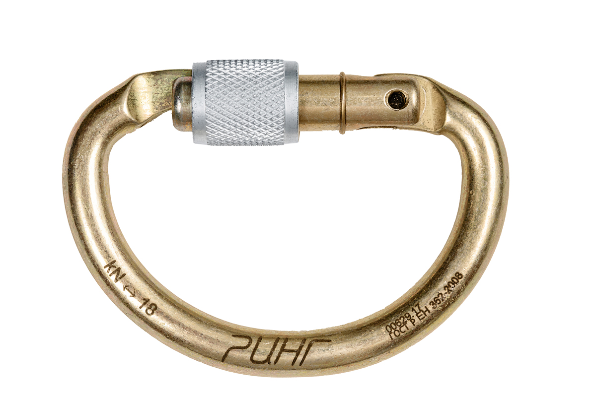Карабин полукруглый стальной 18 кН продольной нагрузки. Застежка кейлок. Является специальным карабином для блокирования обвязок. Для спелеологических работ, и работ в полных обвязках.