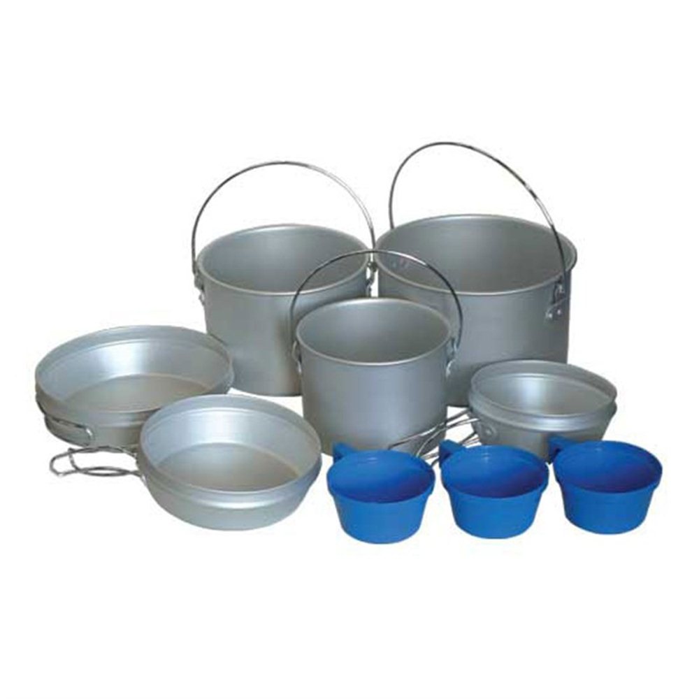 Походный набор посуды из 9 предметов, которые компактно складываются друг в друга. 3 котелка, 3 сковородки и 3 кружки.