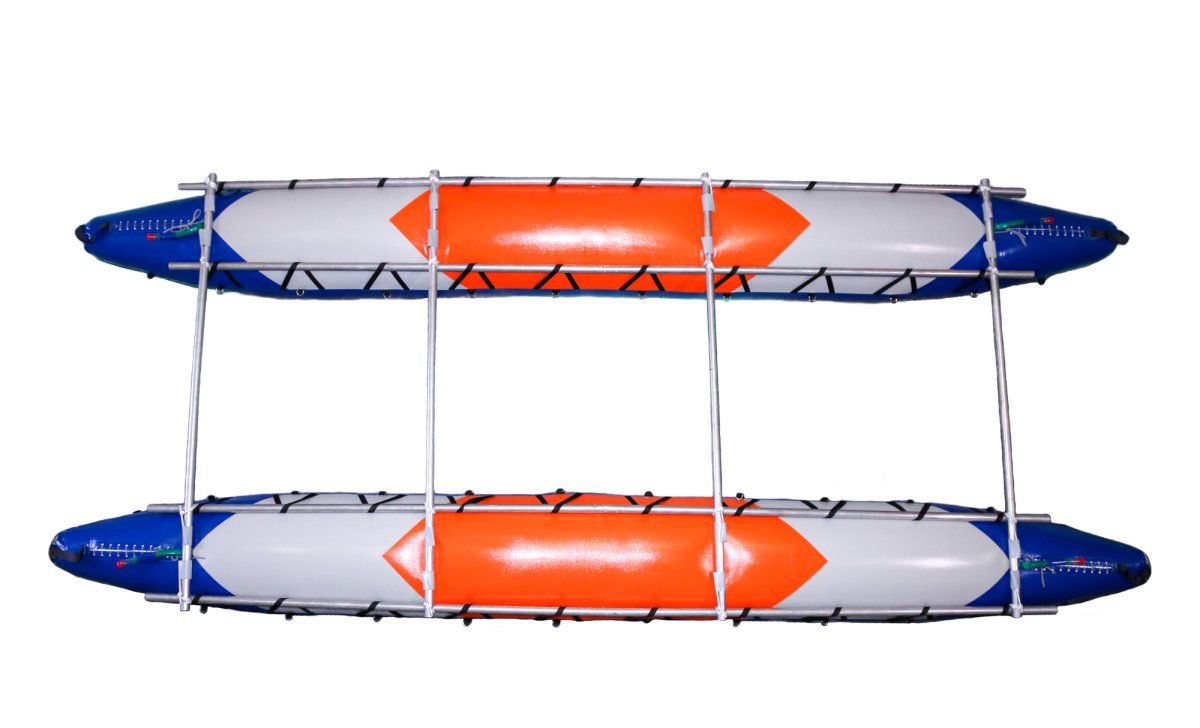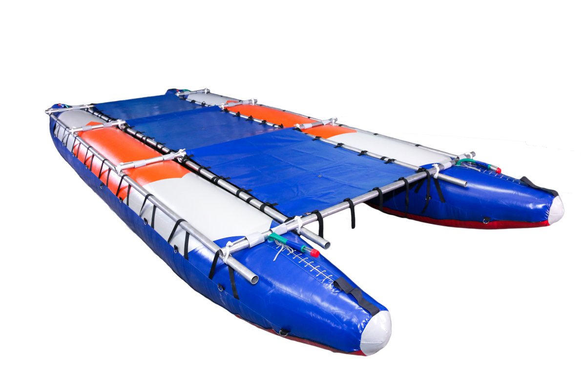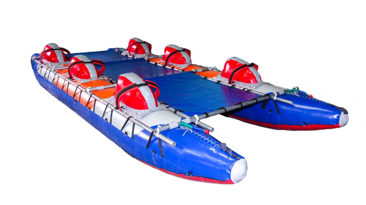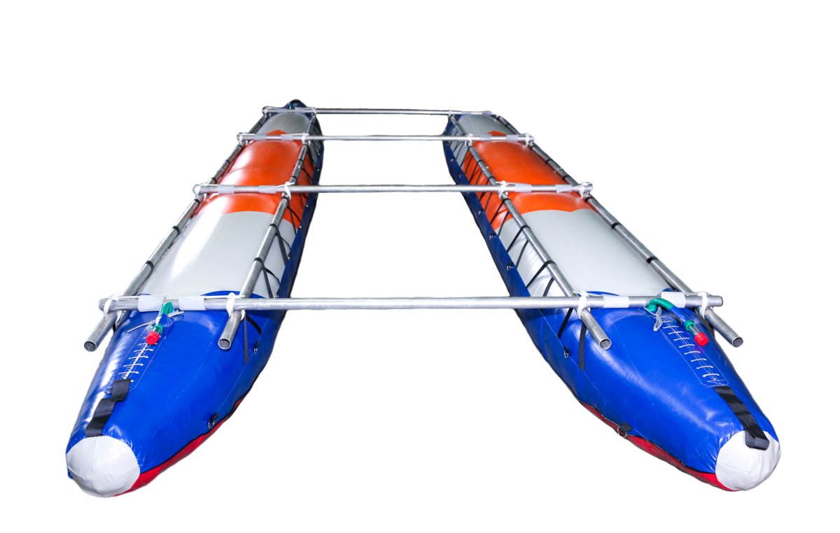 - Баллоны катамарана двухслойной конструкции состоят из гондол и внутренних баллонов. Гондолы сделаны полностью из ткани с ПВХ покрытием, дно из ткани плотностью 900г/м.кв, бок и верх из ткани плотностью 650г/м.кв. Надежная и прочная ткань ПВХ предохраняет от повреждения внутренние баллоны, не намокает от воды, легко моется