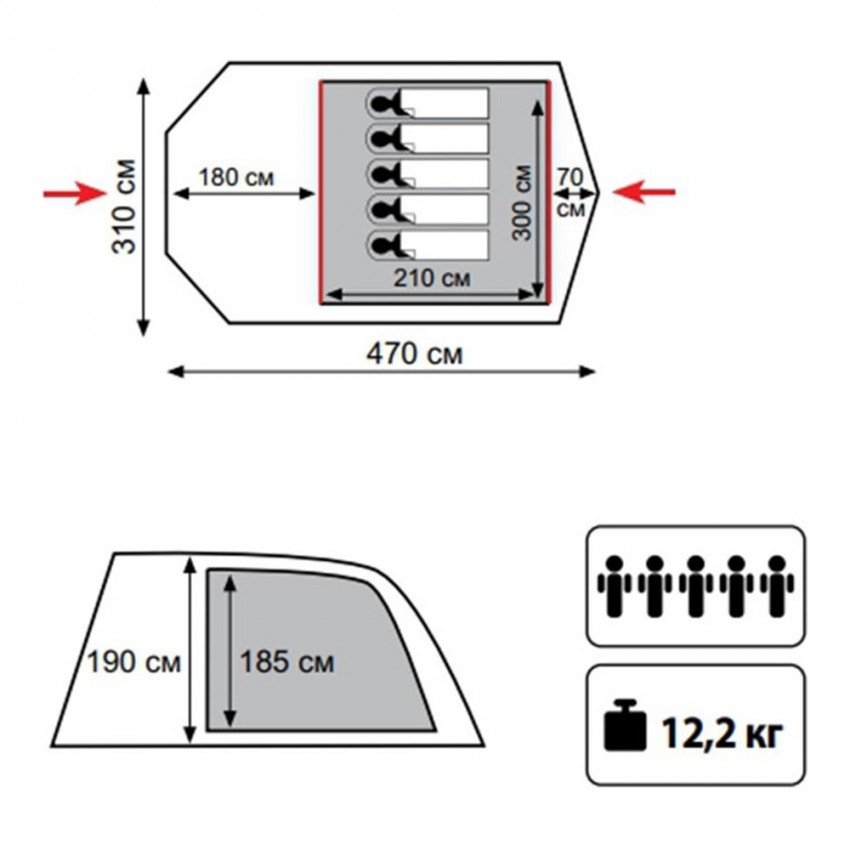 - Размеры внутренней палатки: 210х300х185 см