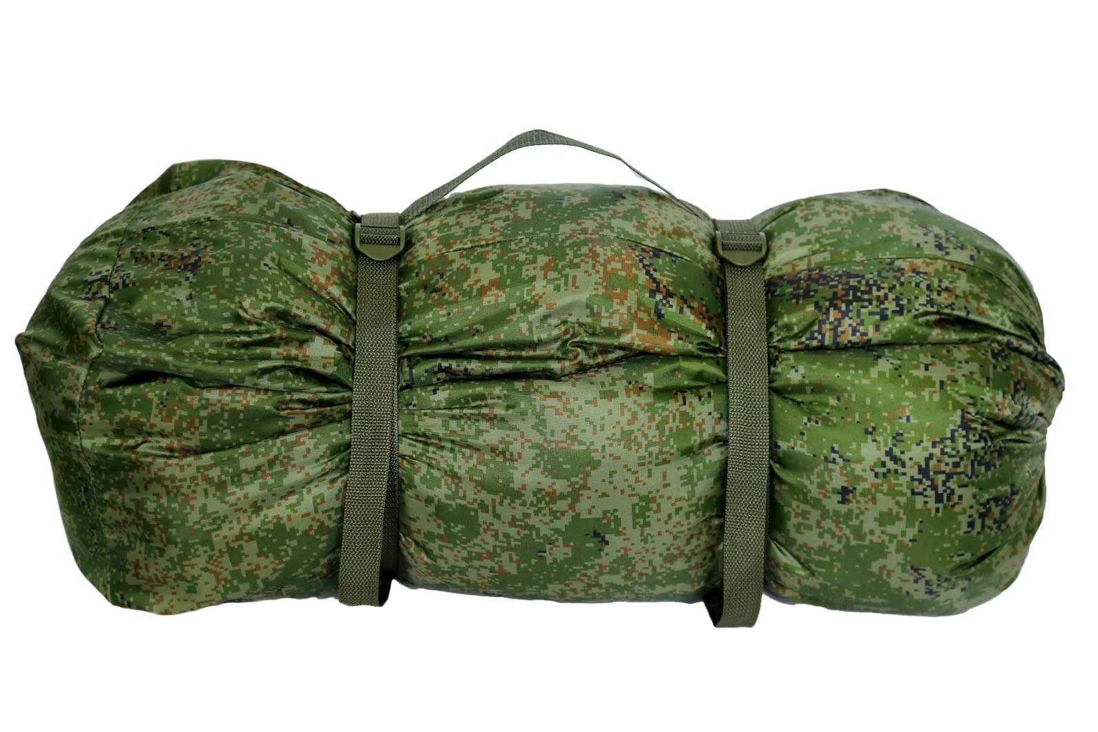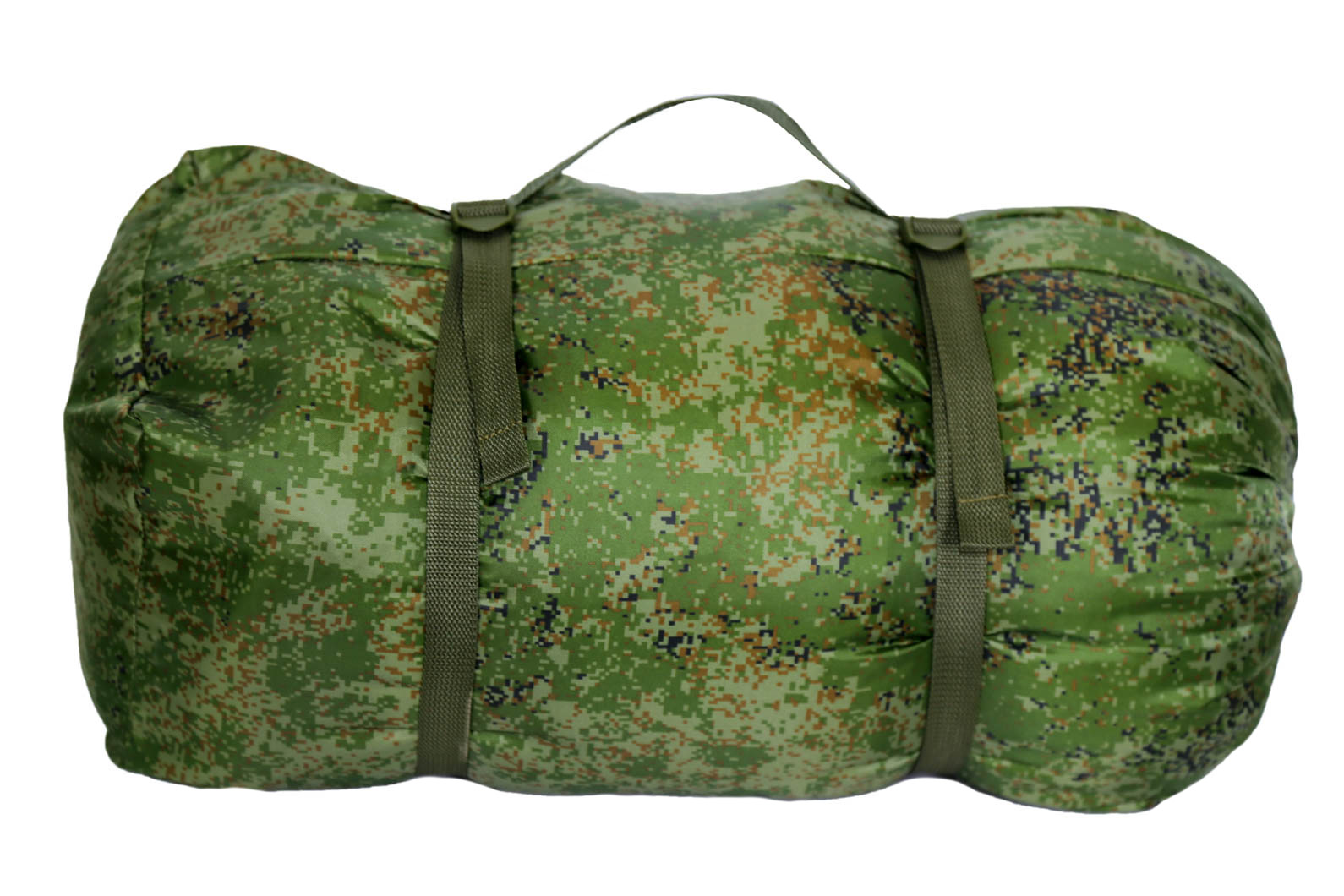 Чехол имеет ручку из стропы и две компрессионные стропы с пряжками. Стропы позволяют уменьшить объем спальника, чтобы он занимал меньше места в рюкзаке