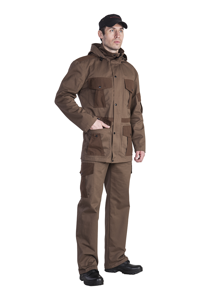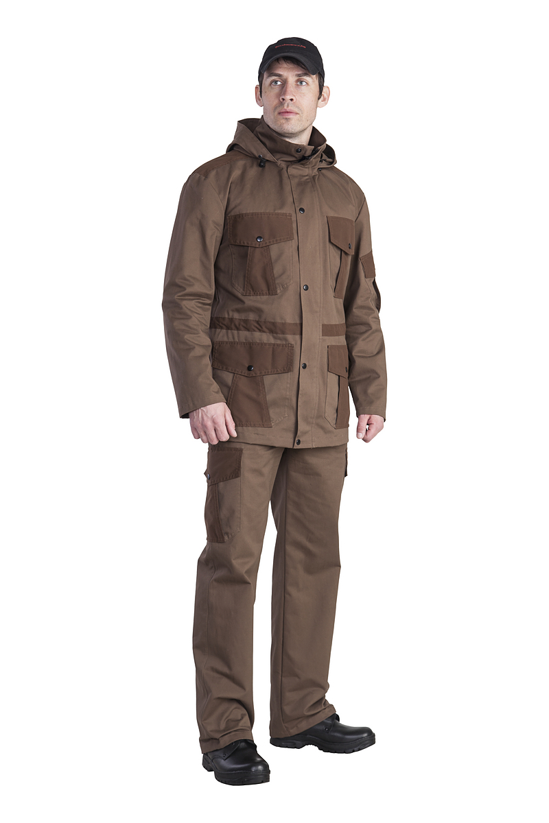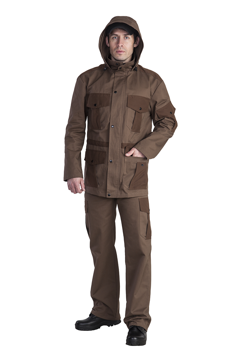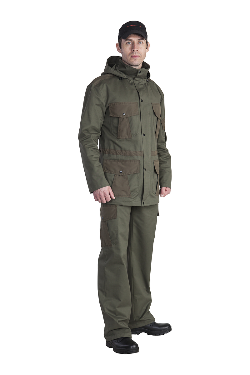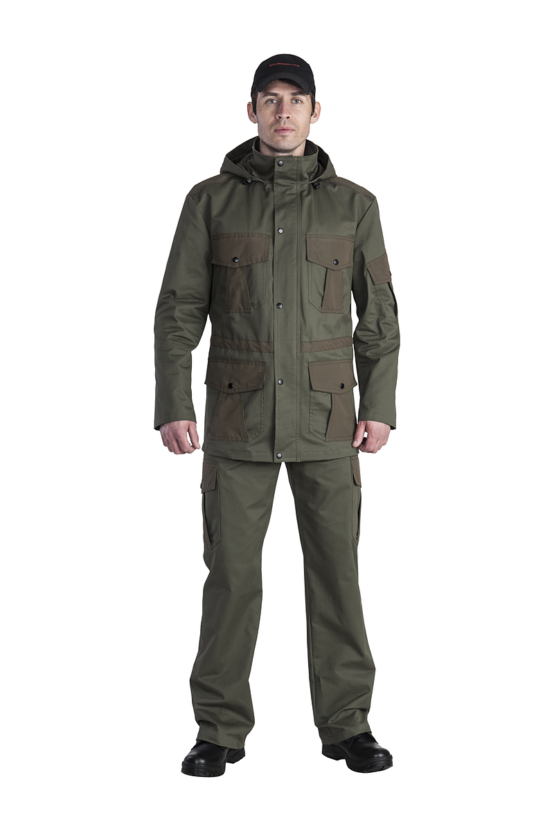 Универсальный мужской костюм Охта для туризма, рыбалки и охоты из прочной износостойкой ткани твилл, состоящей из 100% хлопка, прекрасно защищающей от ветра, дышащей и быстросохнущей.