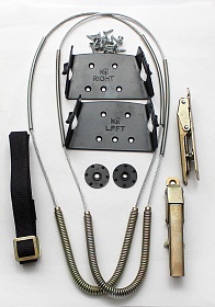 Далее крепим защелку пружины. Для этого в закрепленную скобу опять вставляем ботинок в бахиле и надеваем пружину, при этом заводим ее в ограничители на скобе. Собачку, в которую вставляется пружина, выгоняем на болте в середину регулировки. Положение закрытой защелки и определяет места крепления защелки, чтобы была возможность регулировки натяжения пружины и изменения размера (при необходимости) ботинка . Еще один полезный совет: прорези скобы, куда вставляется ремешок, лучше обработать надфилем, чтобы убрать острые кромки. Иначе они могут послужить причиной преждевременного порыва ремня. Это место можно укрыть изоляционной лентой. Обратите внимание – ремень можно заменить на более прочный (типа ремешка для собак).