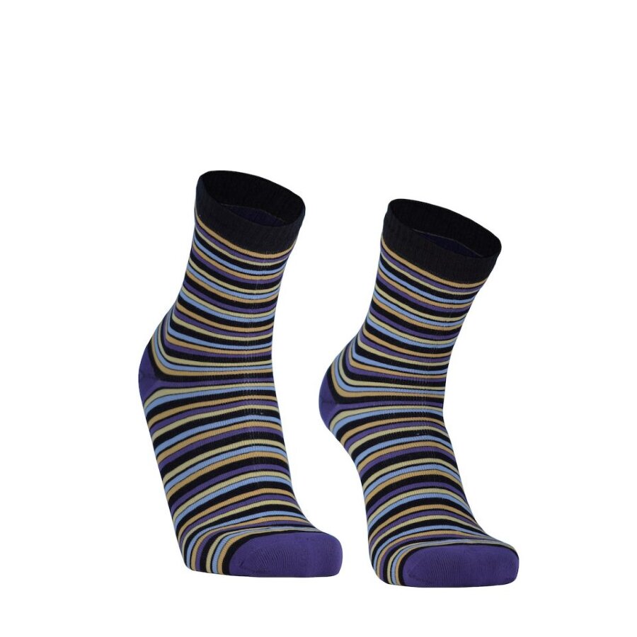 Водонепроницаемые носки Waterproof Ultra Flex Socks. Изготовлены из трех слоев разных по составу материалов. Основной функциональный слой - это мембрана Porelle, которая пропускает сквозь себя воздух, но влага может проникать лишь в одну сторону. Поэтому носки отводят от кожи пот, но не промокают от воды снаружи. Внутренний слой состоит из 60% бамбуковой вискозы и 40% нейлона, он комфортный на ощупь, гипоалергенный, а нейлон для износостойкости. Именно благодаря прочности нейлона, он занимает 98% в составе внешнего слоя материала, делая носки долговечными. Еще 2% приходитcя на эластичные добавки. Это модель длиною до голени, с яркими цветными полосками, фиолетовой пяткой и носком, черной резинкой по верху.