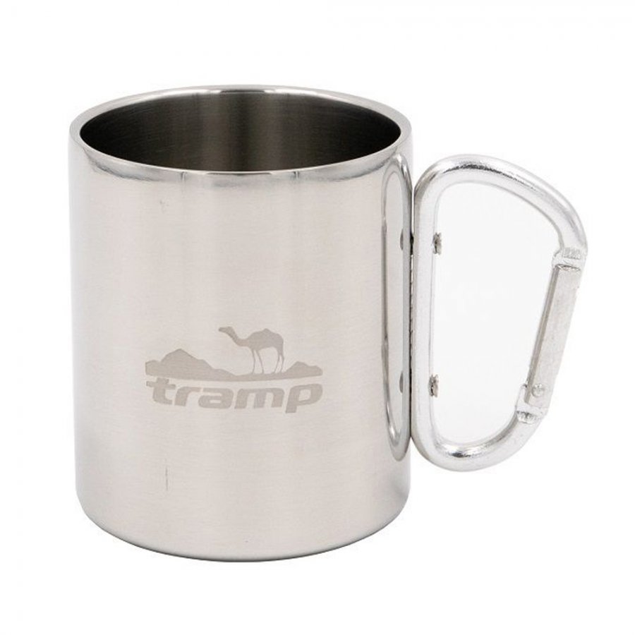 Туристическая термокружка с ручкой-карабином на 350 мл пристёгивается за карабин к поясу, лямке на рюкзаке или к органайзеру в лагере —  не потеряется.