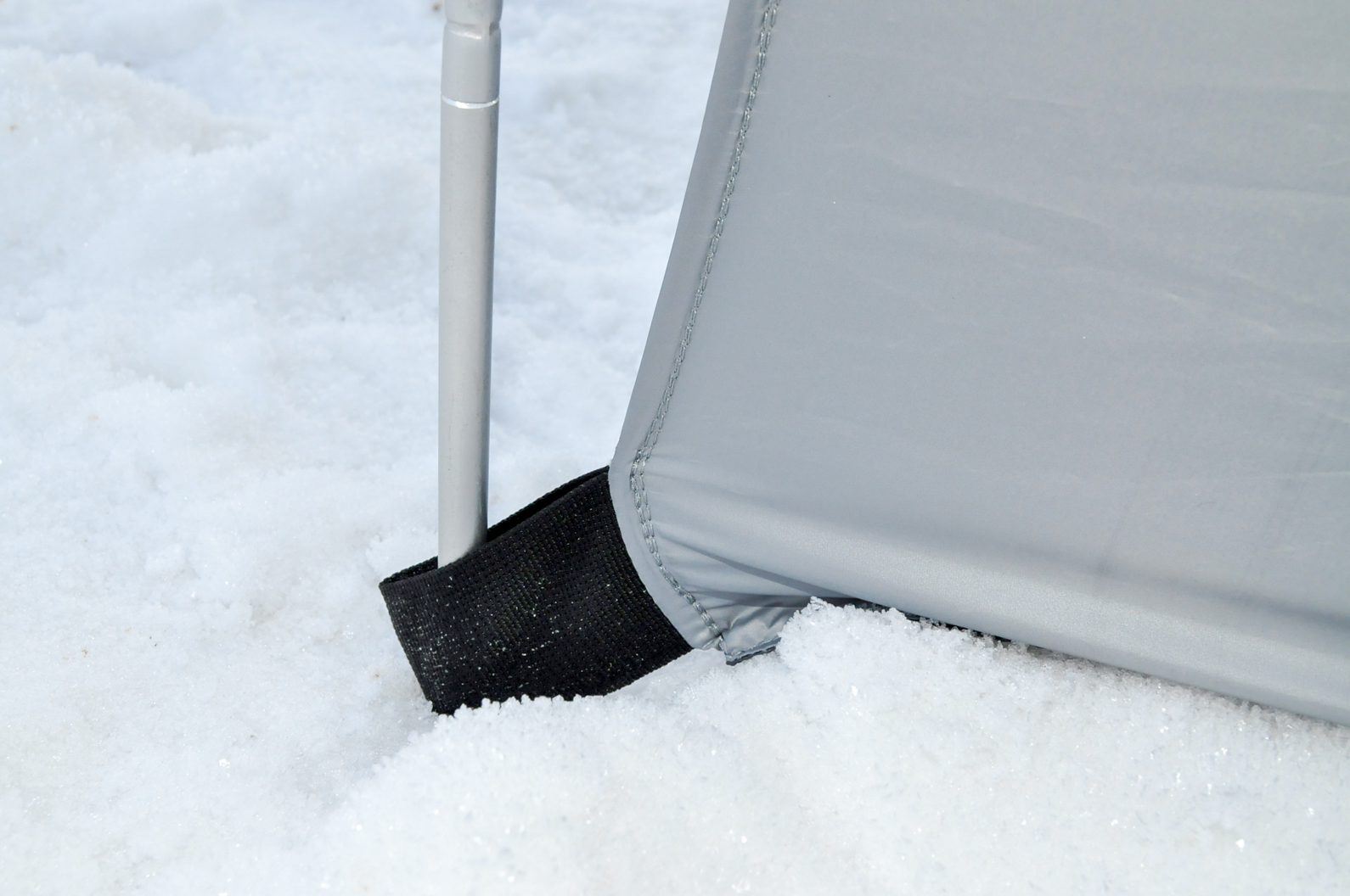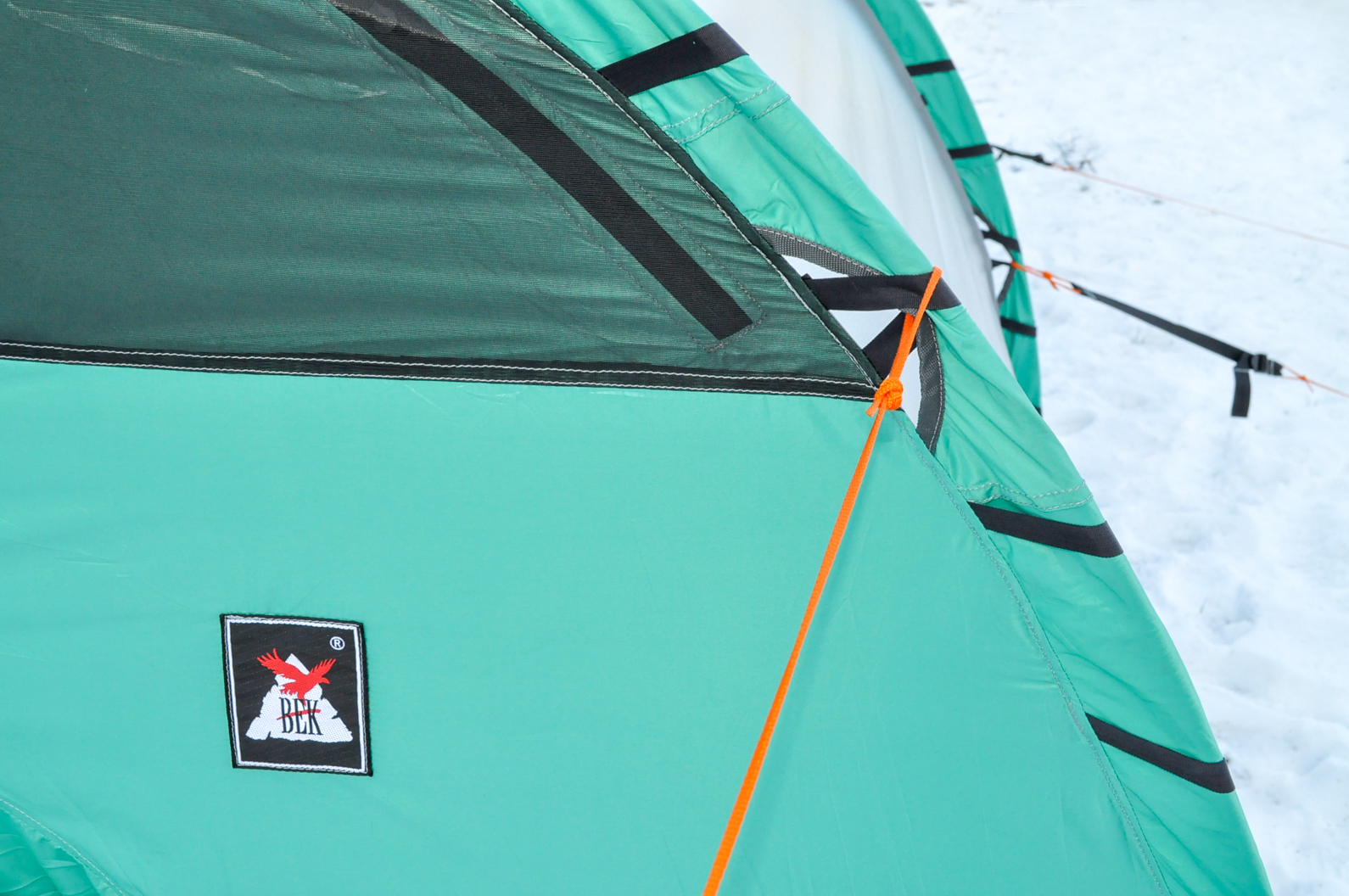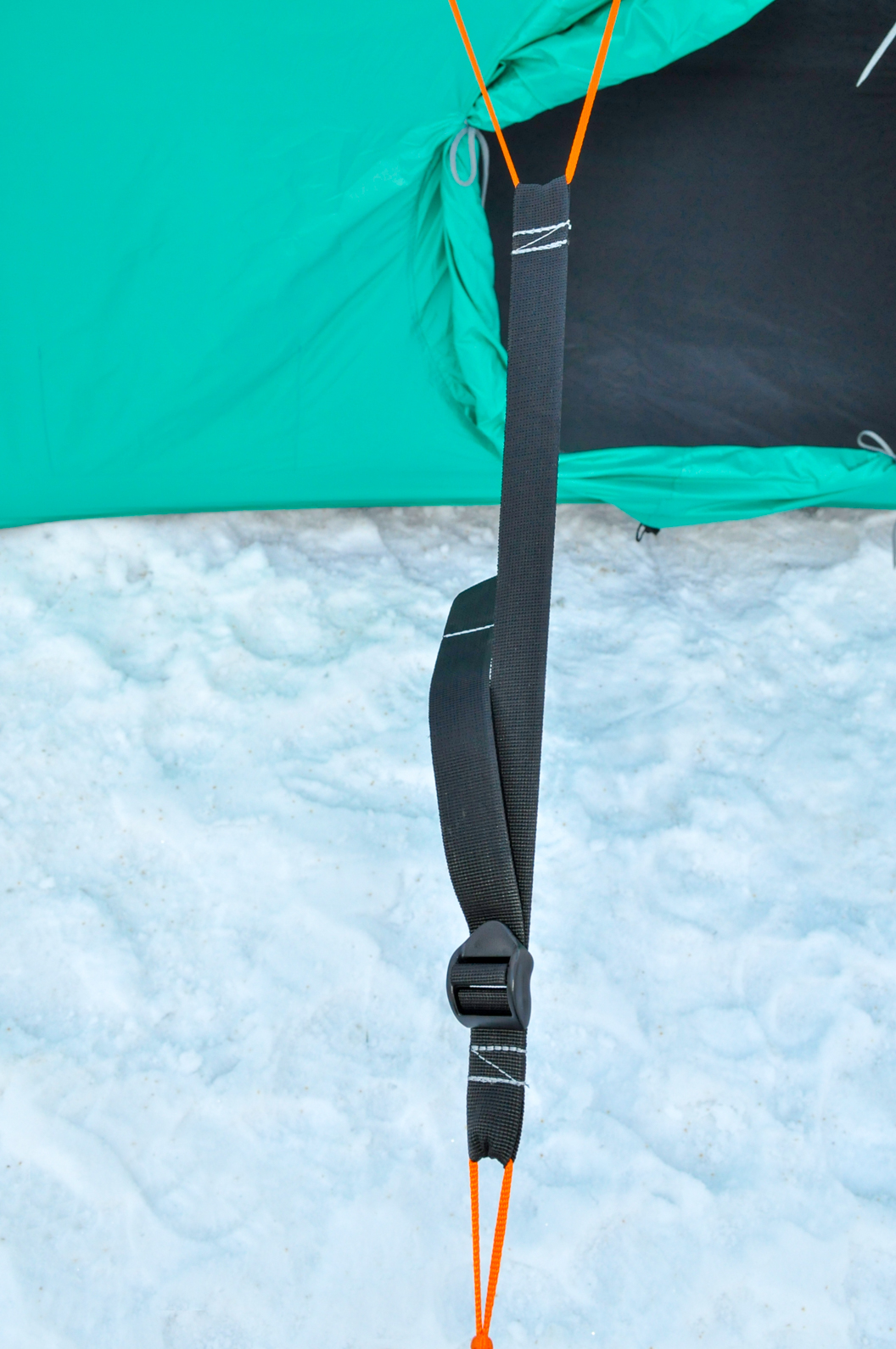Ещё одна отличительная особенность от классических палаток в том, что каждая оттяжка имеет стропу с силовой пряжкой. Подтягивая за стропу можно задать необходимое натяжение палатки. Быстро и просто