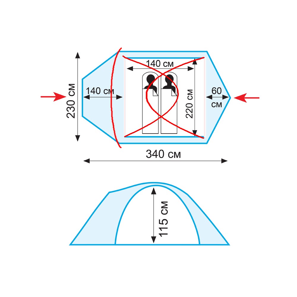 Размеры внутренней палатки: 220 x 140 х 115 см