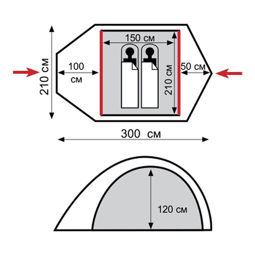 Двухместная двухслойная туристическая палатка с вместительным тамбуром для вещей и юбкой для защиты от ветра и снега. Дуги из алюминиевого сплава. Универсальная серия Tramp.