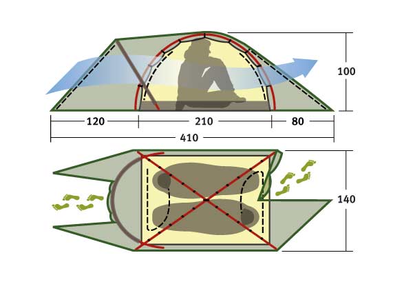 Палатка NAKRA 2 имеет два комфортных раздельных входа. Главный вход надежно защищен боковыми тентовыми конструкциями, благодаря чему при сильных порывах ветра задувание холодного воздуха полностью исключается.