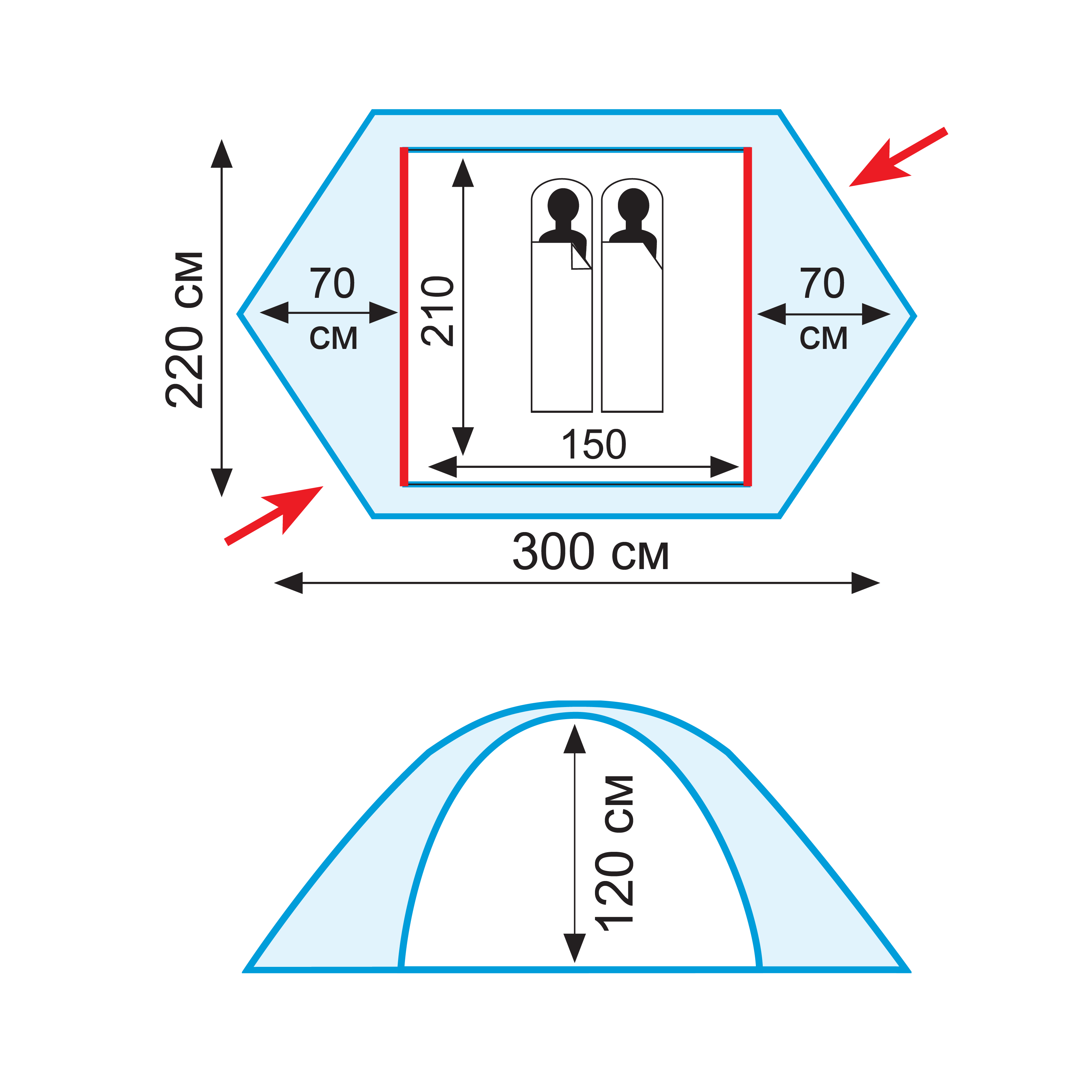 Дуги расположены во внешнем тенте, быстрая установка