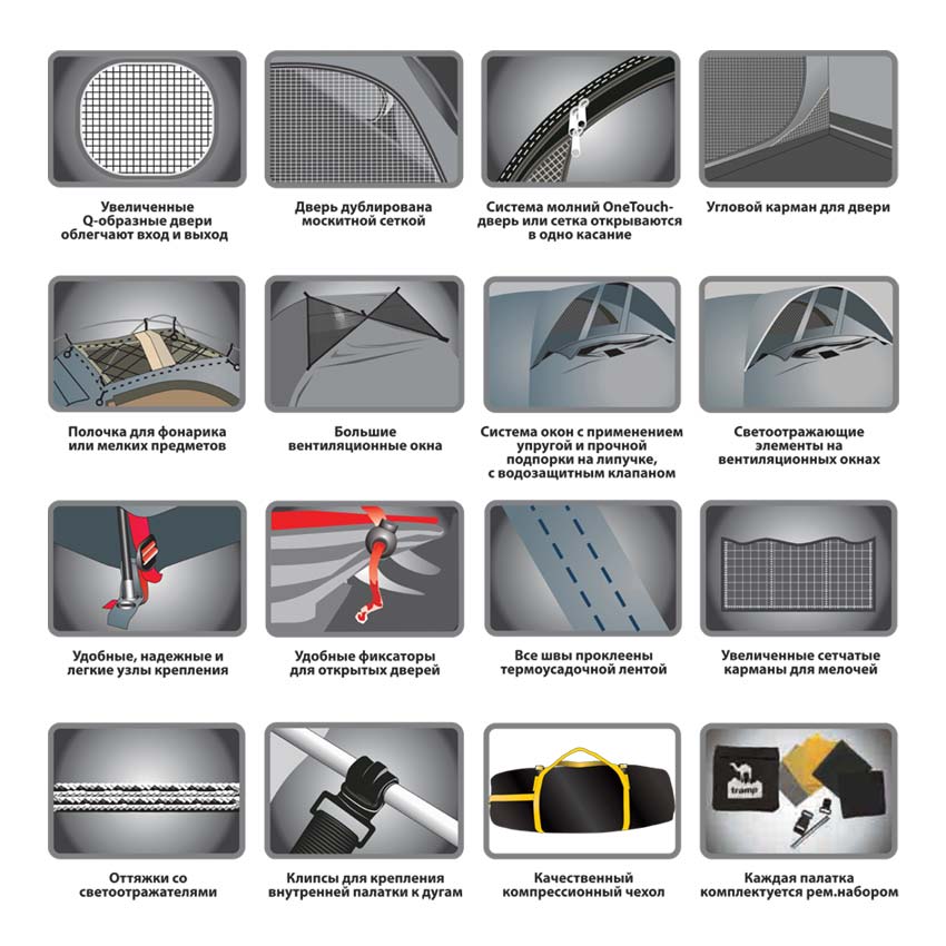 Универсальные туристические палатки Tramp рассчитаны на любителей пеших походов или велосипедных путешествий в весеннее, летнее и осеннее время. Пригодятся они мотоциклистам и охотникам. Небольшой вес, современные материалы, прочность, надежность и долговечность, а также поразительное удобство конструкции - эти палатки отлично подойдут любым искателям приключений!