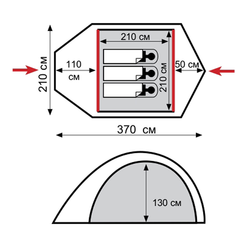 Трехместная двухслойная туристическая палатка с вместительным тамбуром для вещей и юбкой для защиты от ветра и снега. Дуги из алюминиевого сплава. Универсальная серия Tramp.