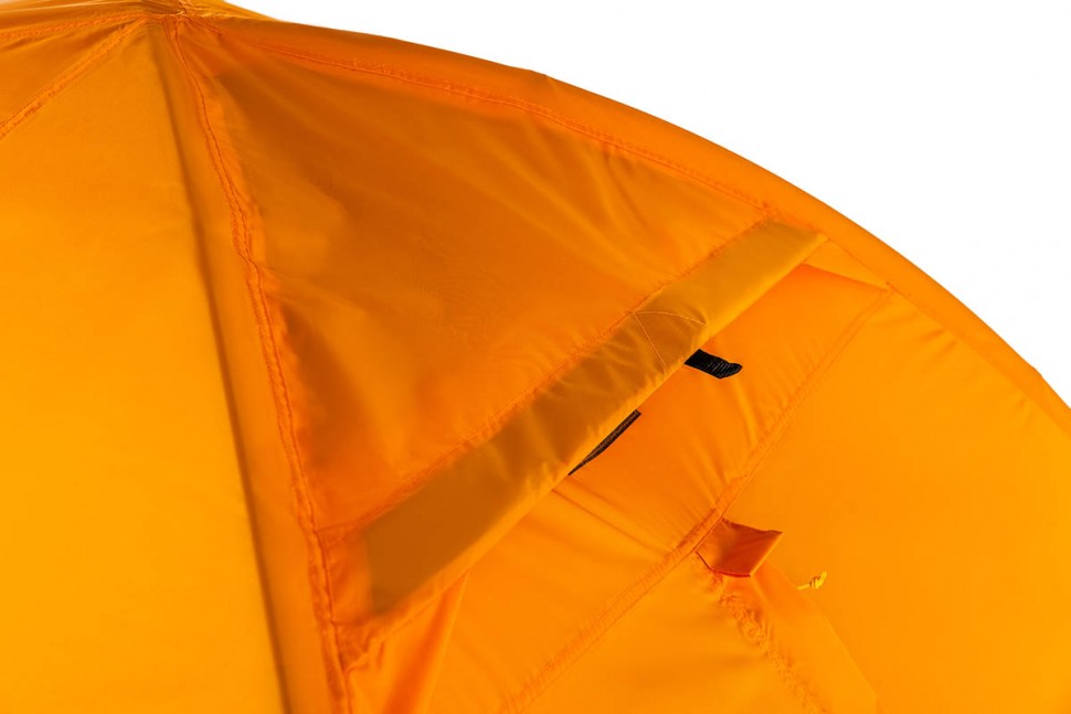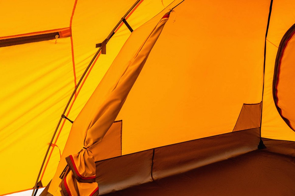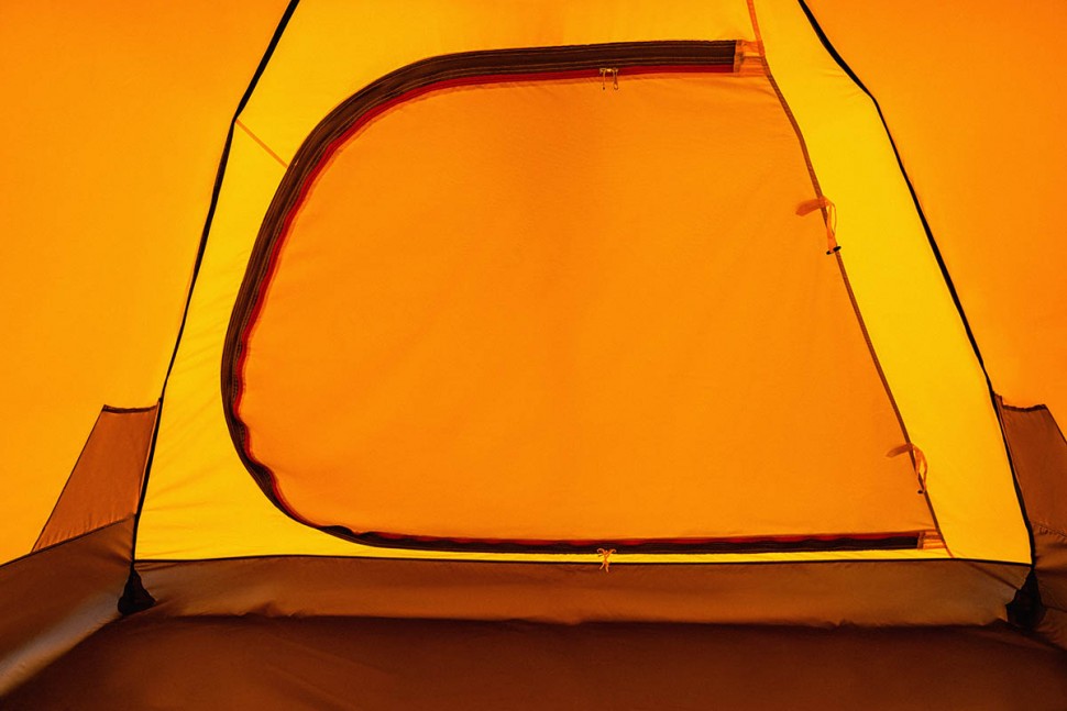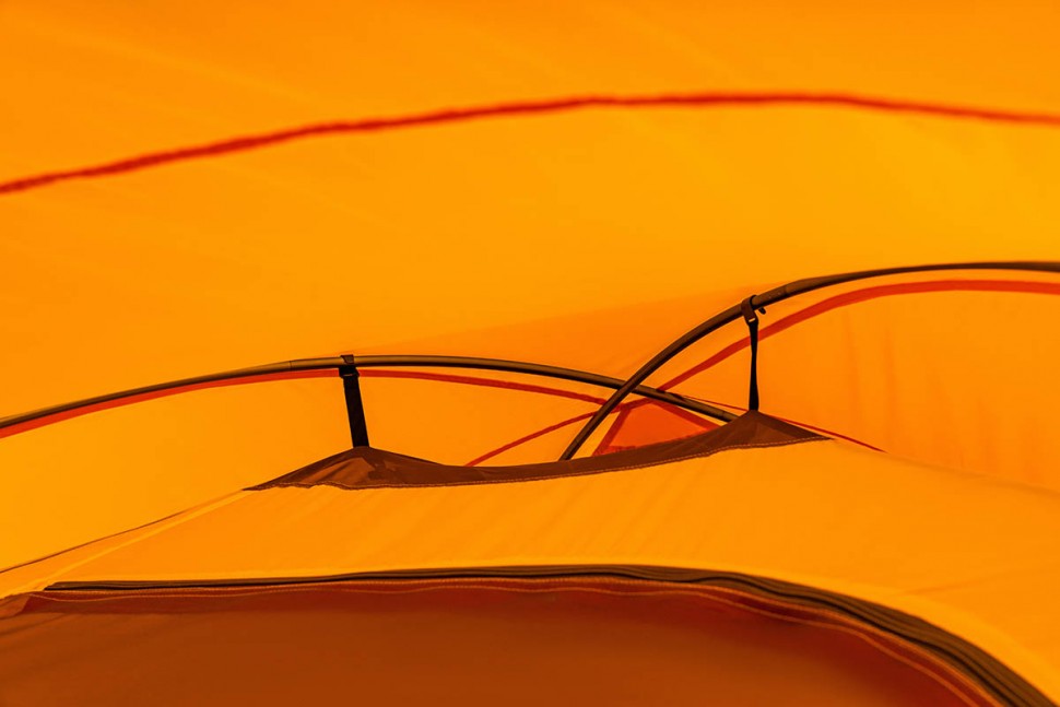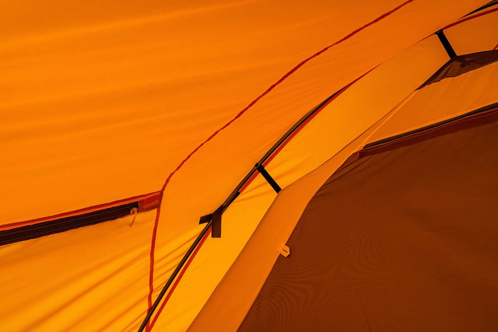 Для тента палатки используется материал Polyester Taffeta, более устойчивый к ультрафиолетовому излучению. Благодаря полиуретановому покрытию материал Polyester Taffeta имеет водоотталкивающие свойства. Такая ткань способна без протекания выдерживать давление водяного столба в 8000 мм, и это после года эксплуатации. Для сравнения — капля грозового дождя может оказать давление до 3000 мм водяного столба. В российском климате достаточным считается показатель в 4000 мм, однако мы предпочитаем закладывать большой запас прочности в свои изделия.