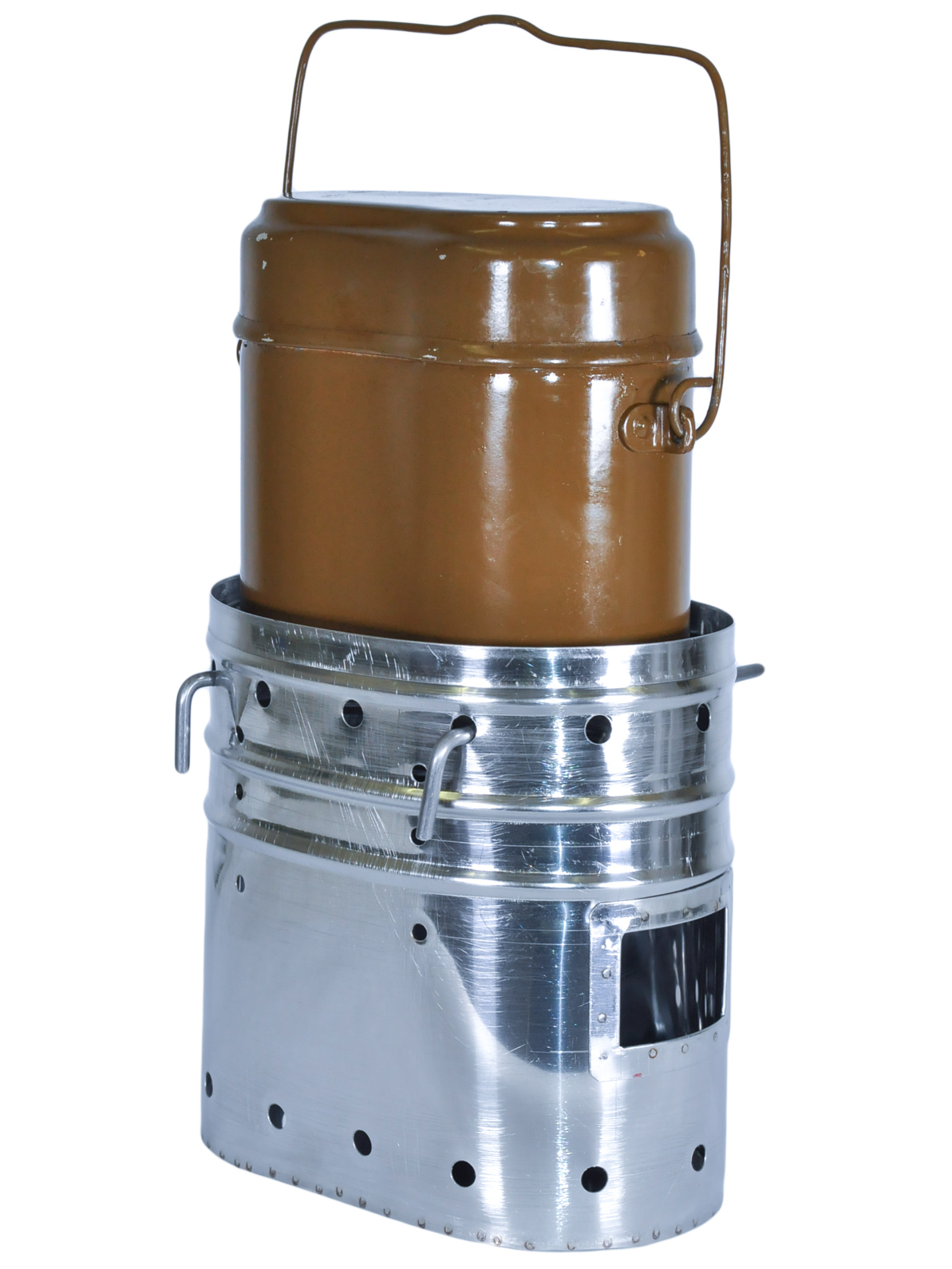 При транспортировке вовнутрь печки легко вставляется армейский котелок (в комплект не входит). Легкую и компактную печку удобно переносить внутри рюкзака