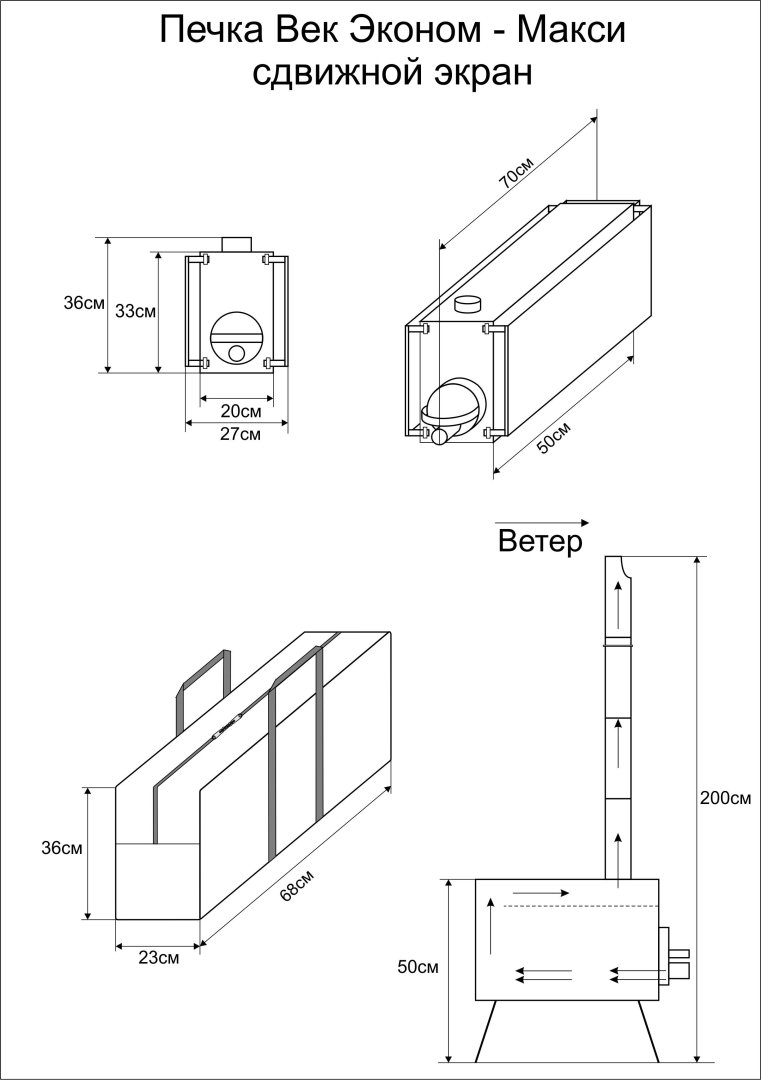 - Сдвижной экран состоит из двух боковых раздвигаемых пластин и одной съемной пластины, закрывающей заднюю часть печки. Сдвижной экран сконструирован таким образом, что при транспортировке он в плотную придвигается к печке и не увеличивает её габариты
