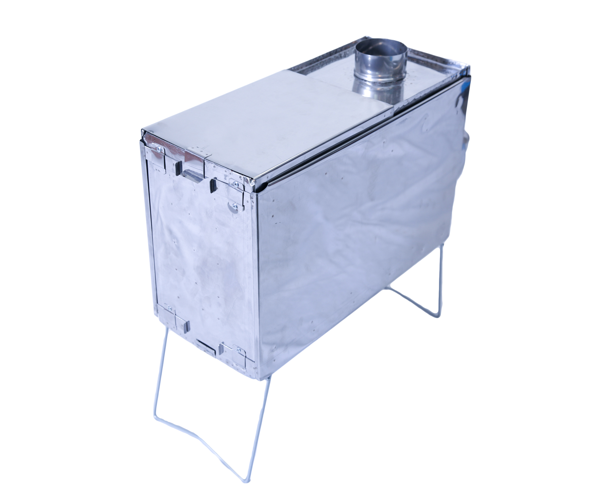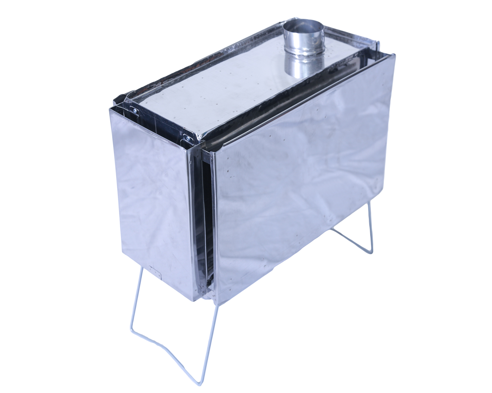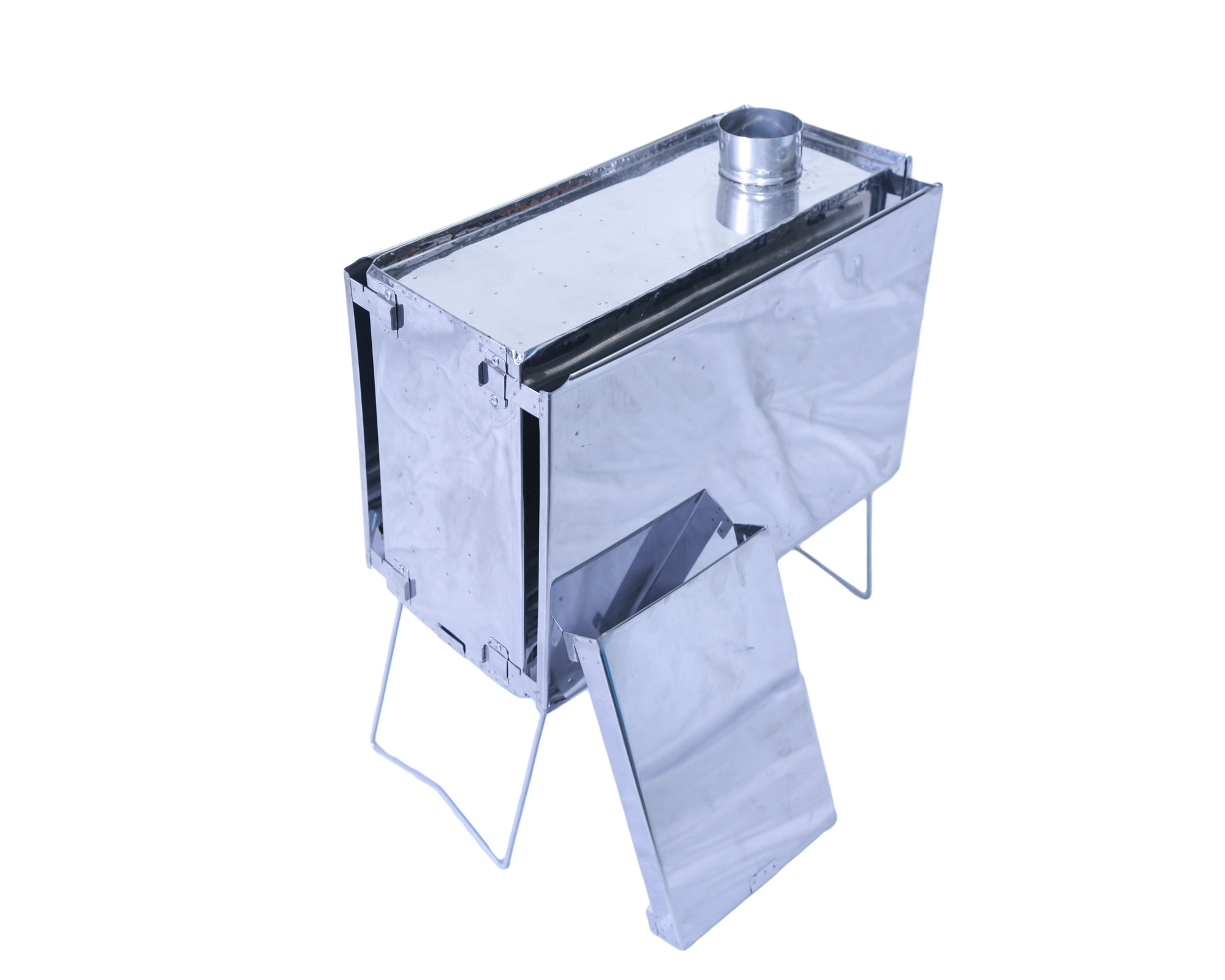 Прекрасно сконструированная туристическая печь с сдвижным экраном с трех сторон для обогрева туристических палаток и шатров. Конструкция печки позволяет максимально использовать теплоотдачу при топке любыми дровами. Легкие печки для обогрева палаток разных модификаций разрабатываются, испытываются и выпускаются фирмой ВЕК с 2005 года. Печки изготавливаются из жаропрочной нержавеющей стали марки AISI-430 толщиной 0,4 мм.