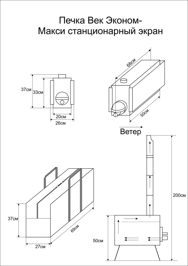 - Экран жестко прикреплен к печке и полностью закрывает печь с трех сторон. Печка рассчитана для обогрева туристических палаток и шатров на 10-12 человек в межсезонье и зимнее время года