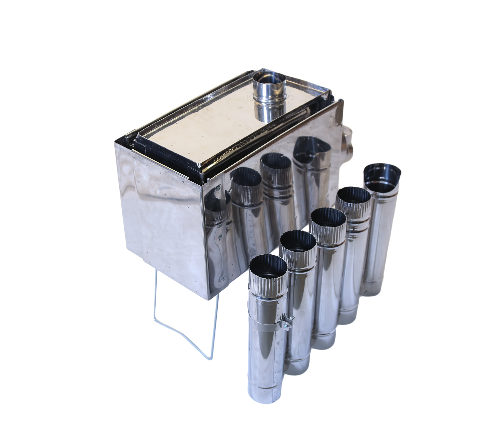 - Колена трубы убираются во внутрь печи при транспортировке. В комплекте 5 колен трубы