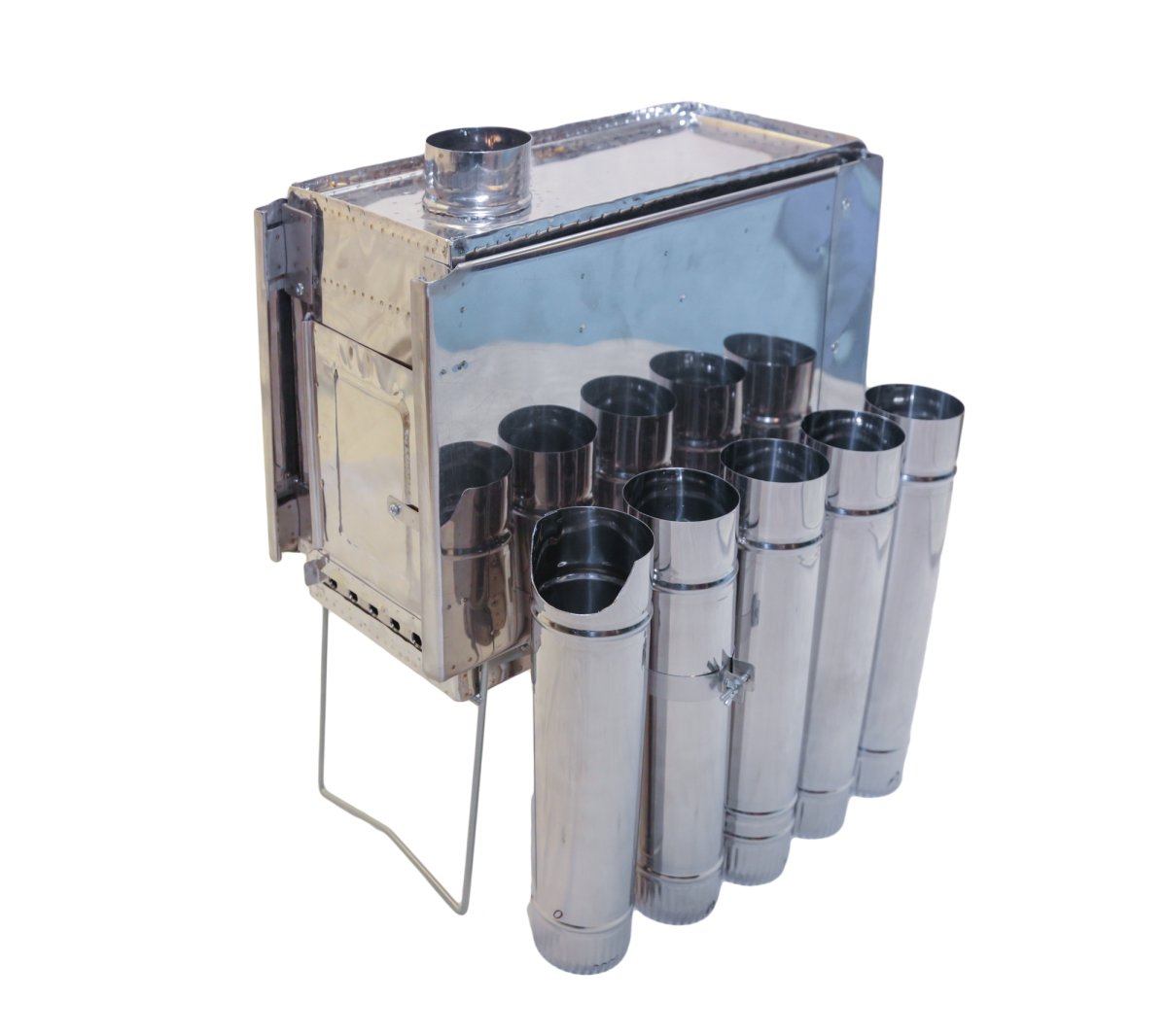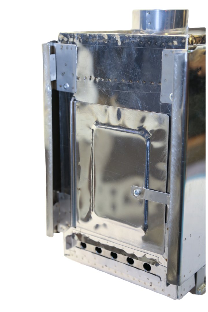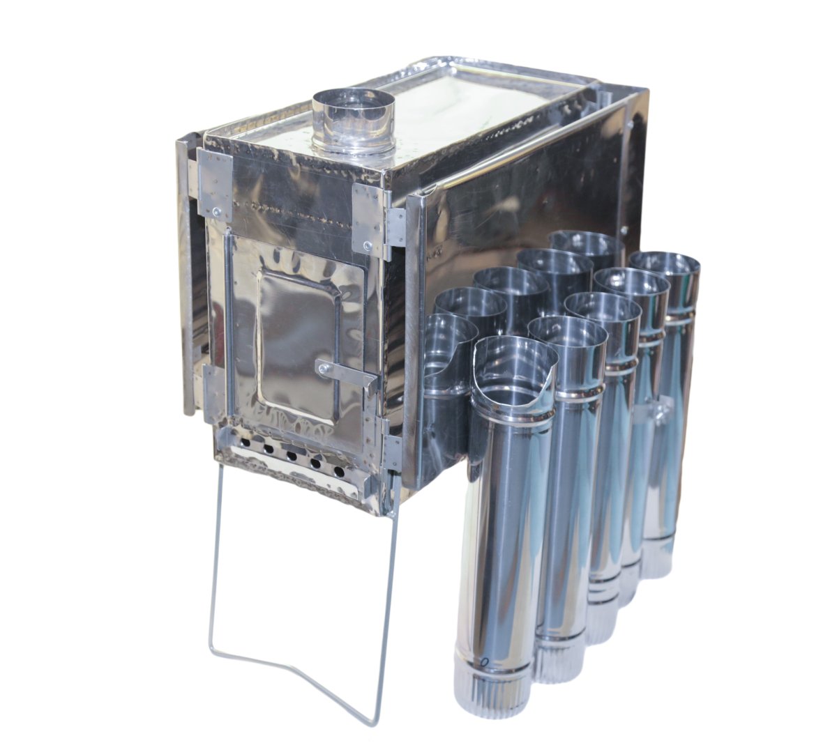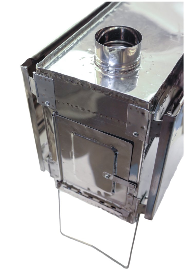 Прекрасно сконструированная туристическая печь с шарнирным экраном с трех сторон для обогрева туристических палаток и шатров. Конструкция печки позволяет максимально использовать теплоотдачу при топке любыми дровами. Легкие печки для обогрева палаток разных модификаций разрабатываются, испытываются и выпускаются фирмой ВЕК с 2005 года. Печки изготавливаются из жаропрочной нержавеющей стали марки AISI-430 толщиной 0,4 мм.