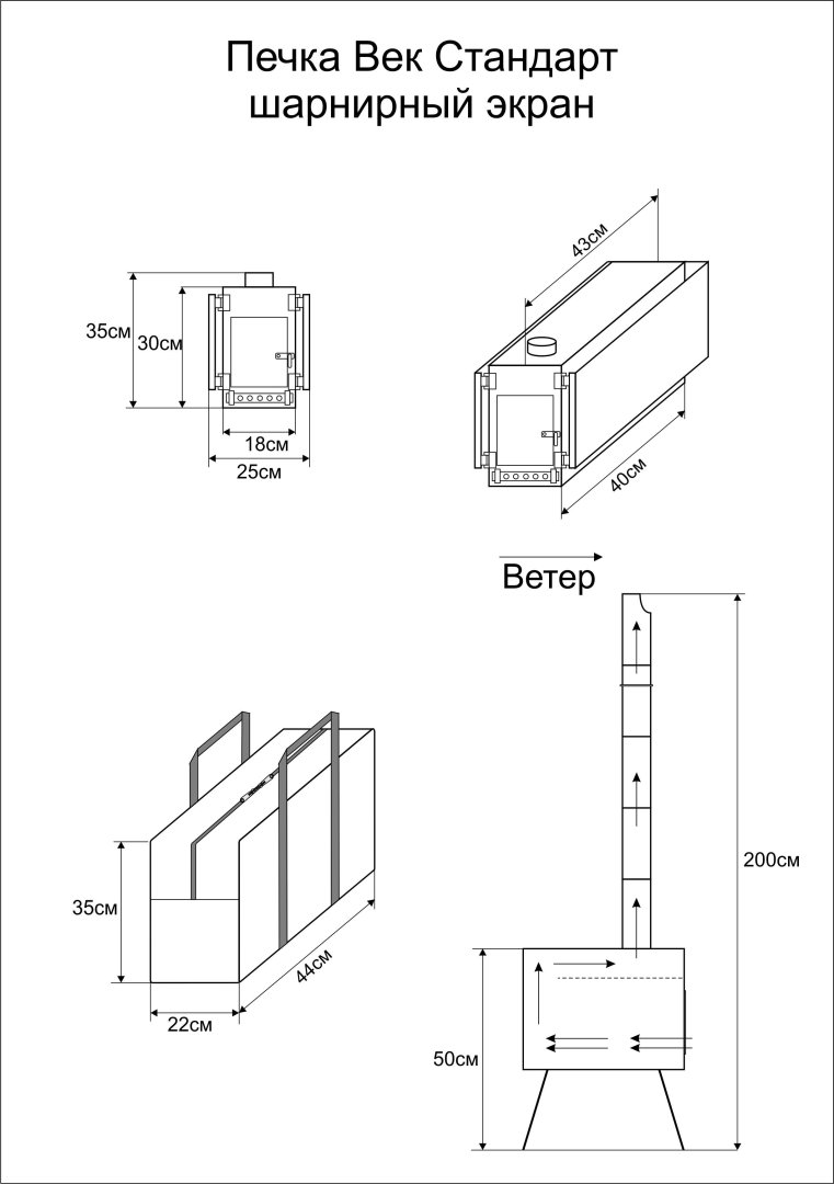 - Шарнирный экран с трех сторон сконструирован таким образом, что в сложенном виде он не увеличивает габариты печки. Экраны печки состоят из двух "Г" образных пластин, закрывающих заднюю и боковые части печки. Экраны прикреплены к печке шарнирными петлями, благодаря чему они просто устанавливаются или складываются