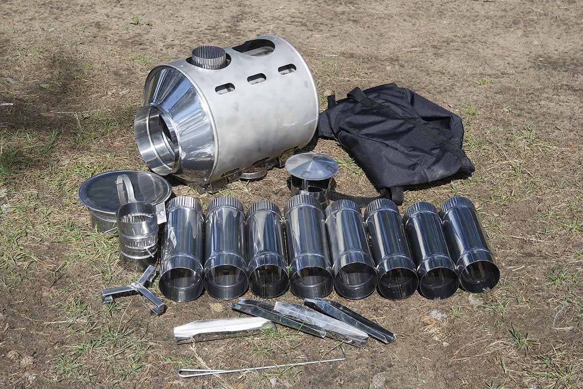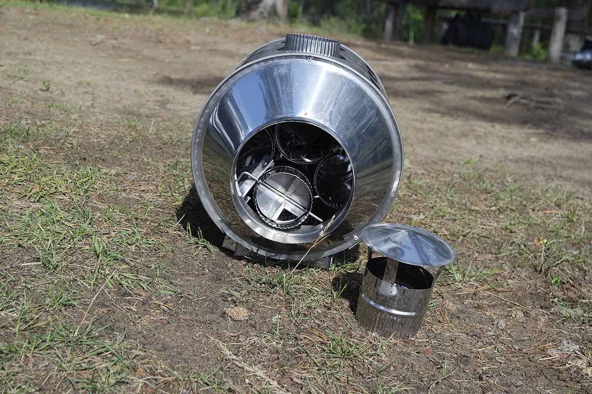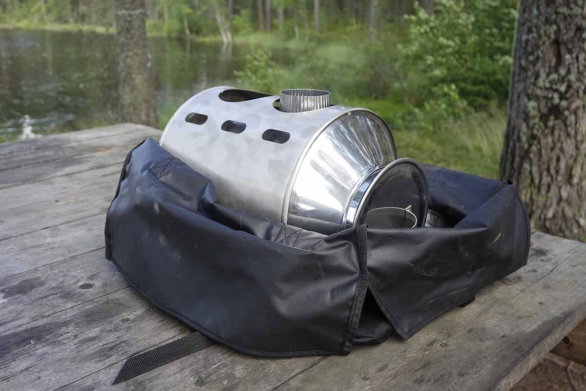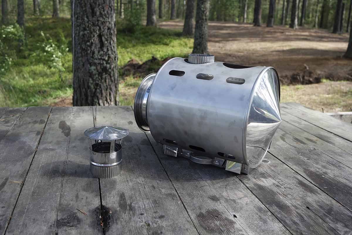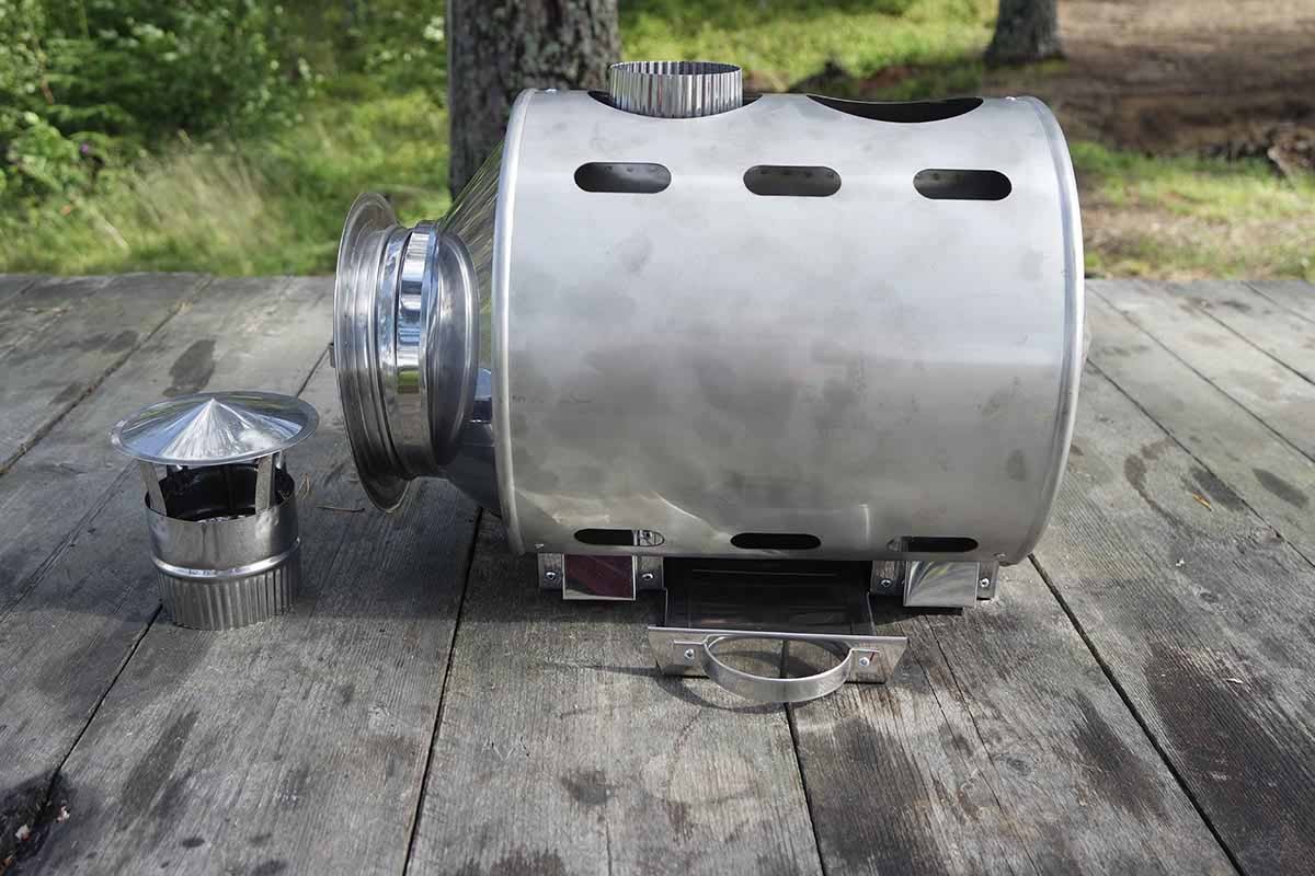 Печь для походной бани, обеспечивает в ней отличную температуру в районе 100 градусов Цельсия примерно за 30 минут. Парогенератор в комплекте, избавит от необходимости прогревать камни. Необходимо залить воду и будет образовываться пар.