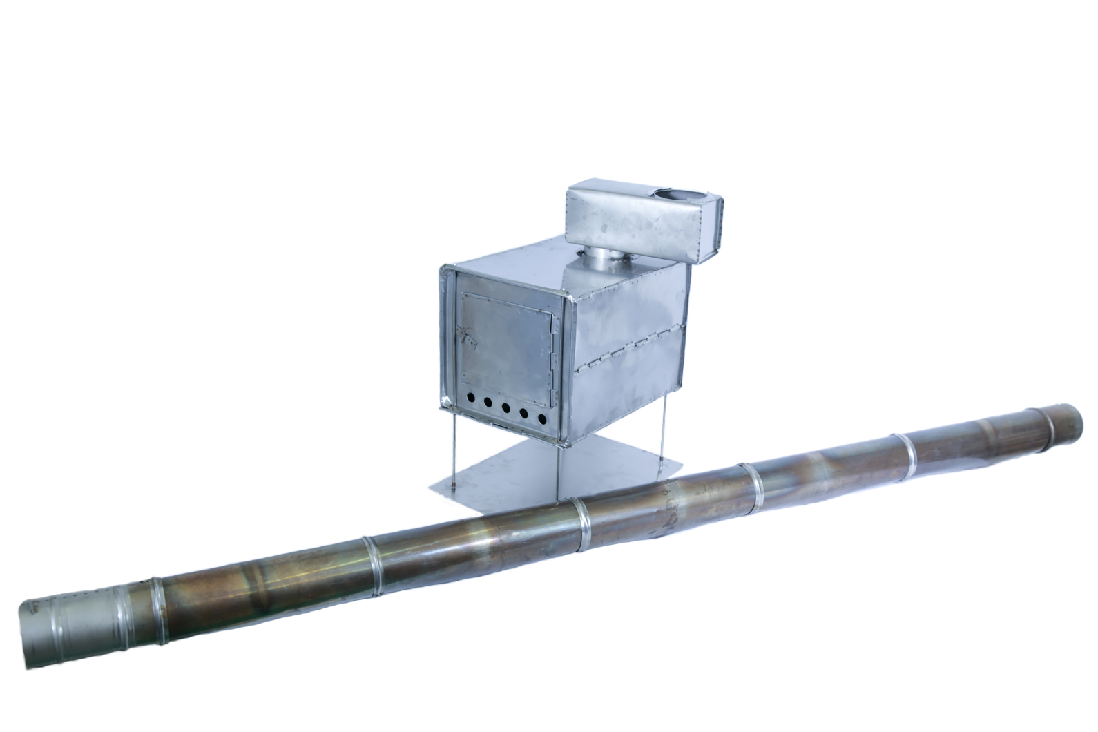 - Труба печки сделана из листа пермаллоя, что значительно облегчает вес, и прочно прикрепляется к печке с помощью переходника. Данная конструкция многократно использовалась в зимних лыжных походах 5-6 категории сложности