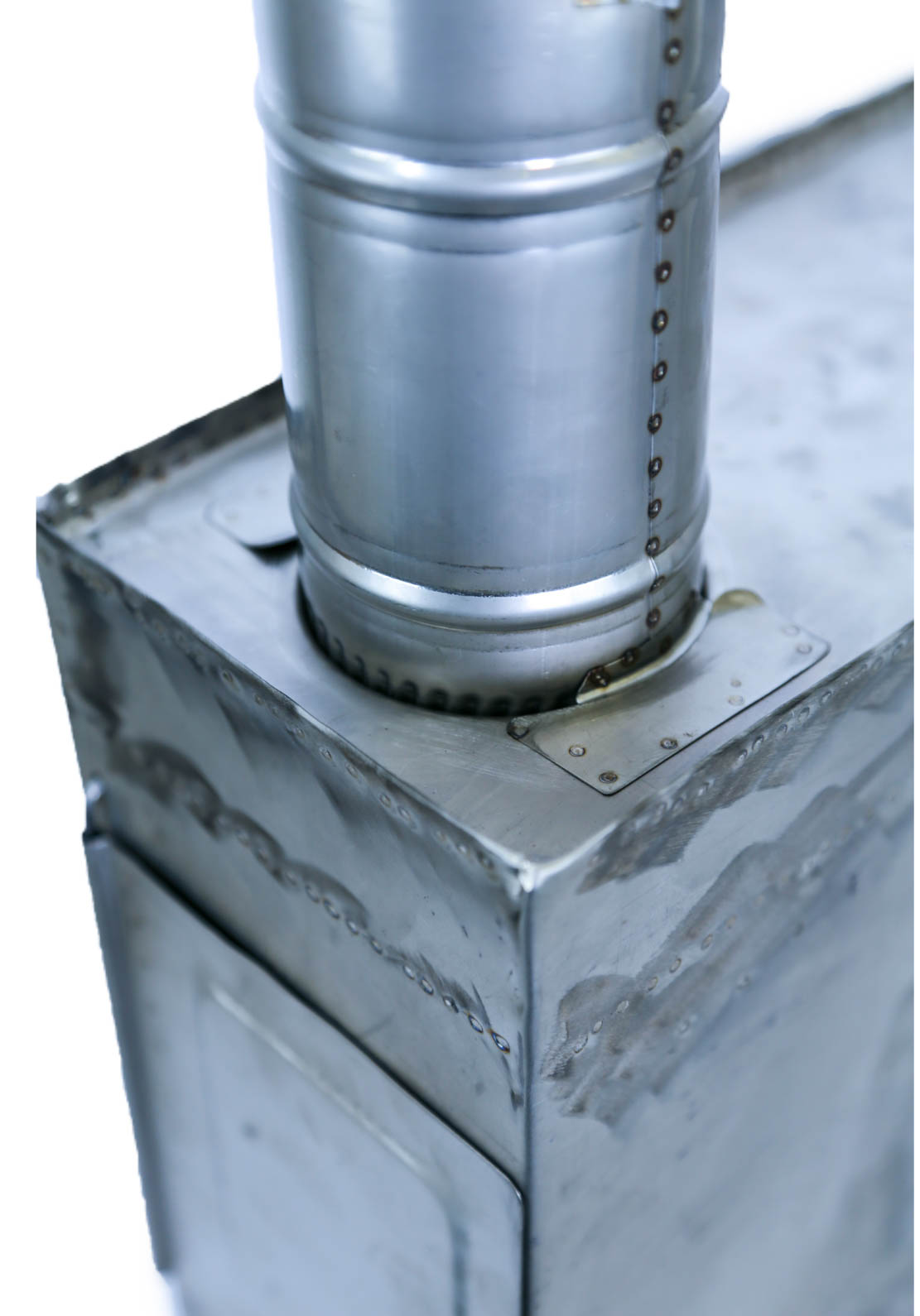 - Труба представляет собой лист пермаллоя шириной 0,25 м и длиной 1,40 м. Труба, скрученная по длинной стороне, превращается в дымоход длиной 1,50 м. Труба прочно прикрепляется к печке с помощью переходника
