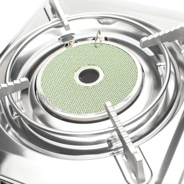 Портативная газовая плитка с переходником работает от двух типов баллонов: одноразового 220 г баллона или от бытового пропанового баллона от 5 до 50 л. Упаковывается в пластиковый кейс. Конфорка керамическая. Верхняя крышка из нержавеющей стали.