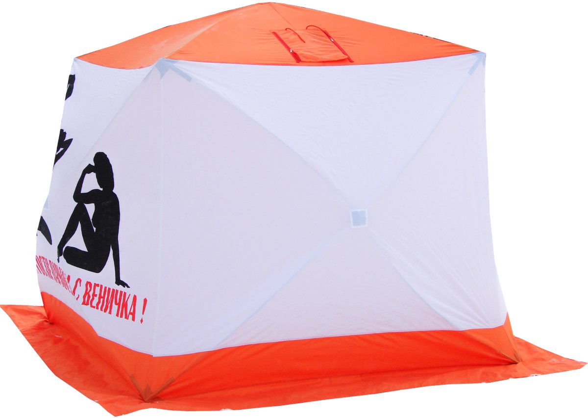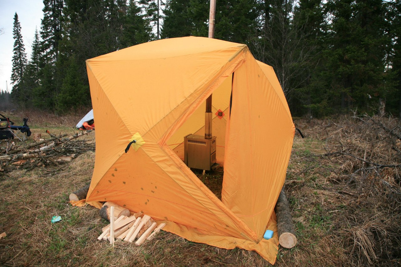- Быстро устанавливаемая палатка для организации бани в походных условиях. Основное преимущество данной бани – это интегрированный каркас, который не надо собирать из отдельных элементов, он вмонтирован непосредственно в палатку баню. Каркас придает палатке форму куба