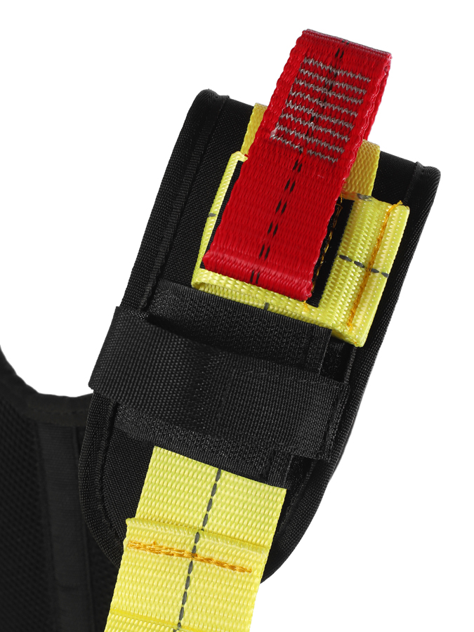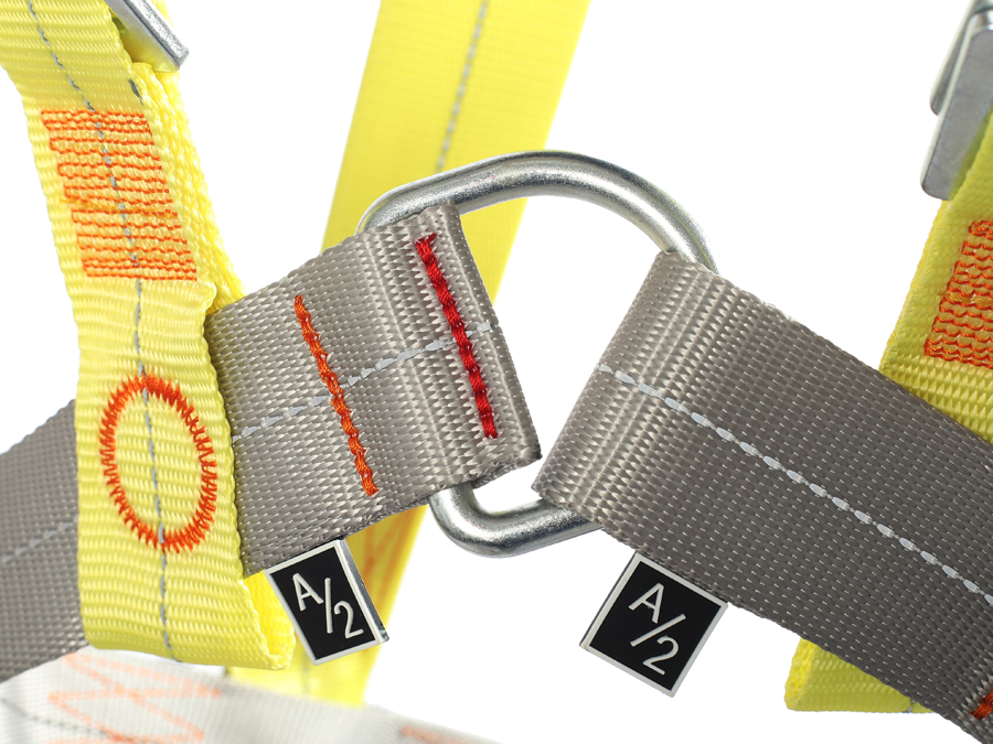Точка крепления на спине, расположенная на Х-образных плечевых лямках, регулируется по высоте для правильного расположения и обеспечения максимального уровня безопасности при остановке падения. Данная точка крепления имеет специальный удлинитель для возможности соединения с другими устройствами, в том числе в случае надевания привязи под спецодежду.